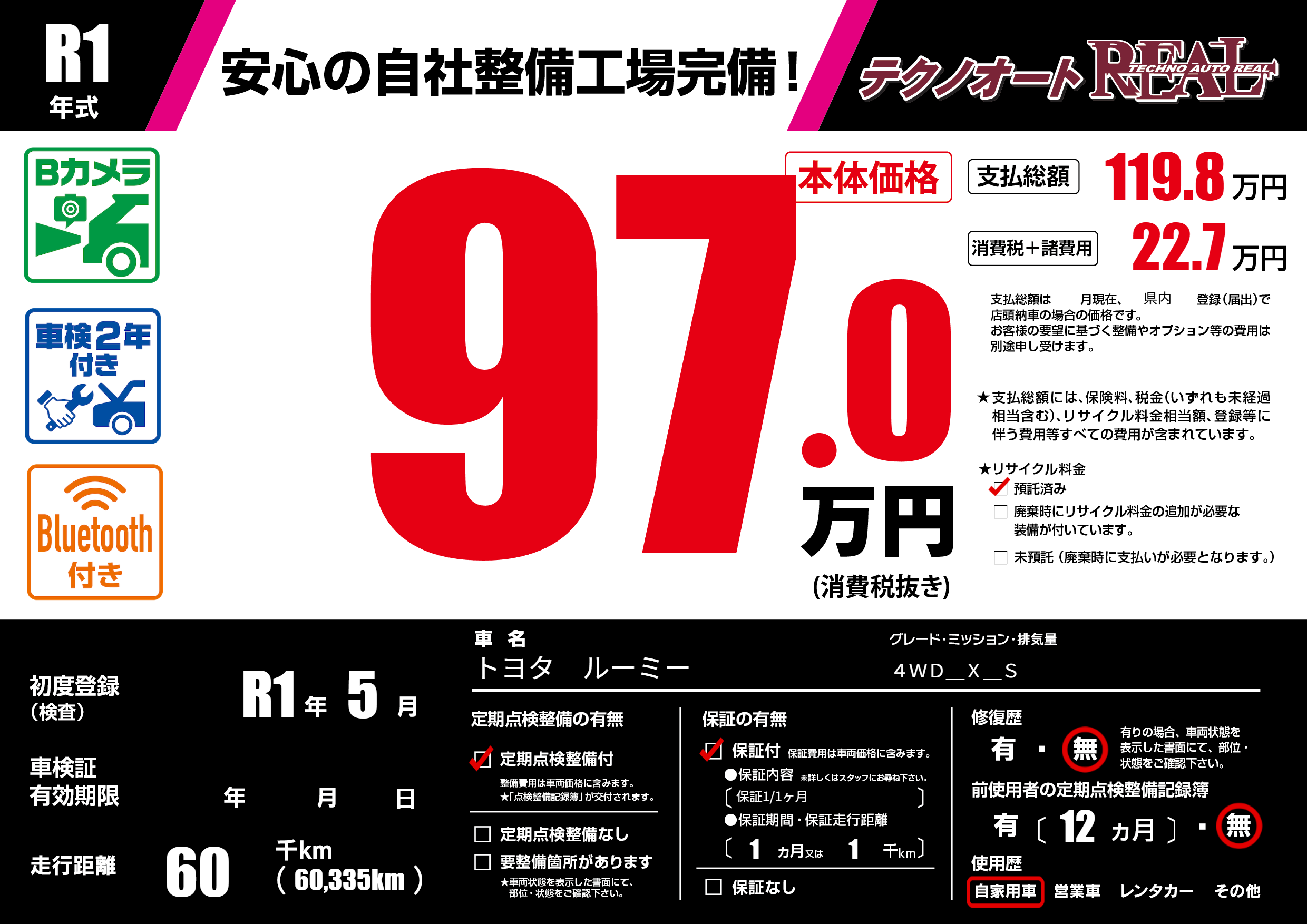 | 走行キロ | 6万km | 初年度登録 | R1年5月 |