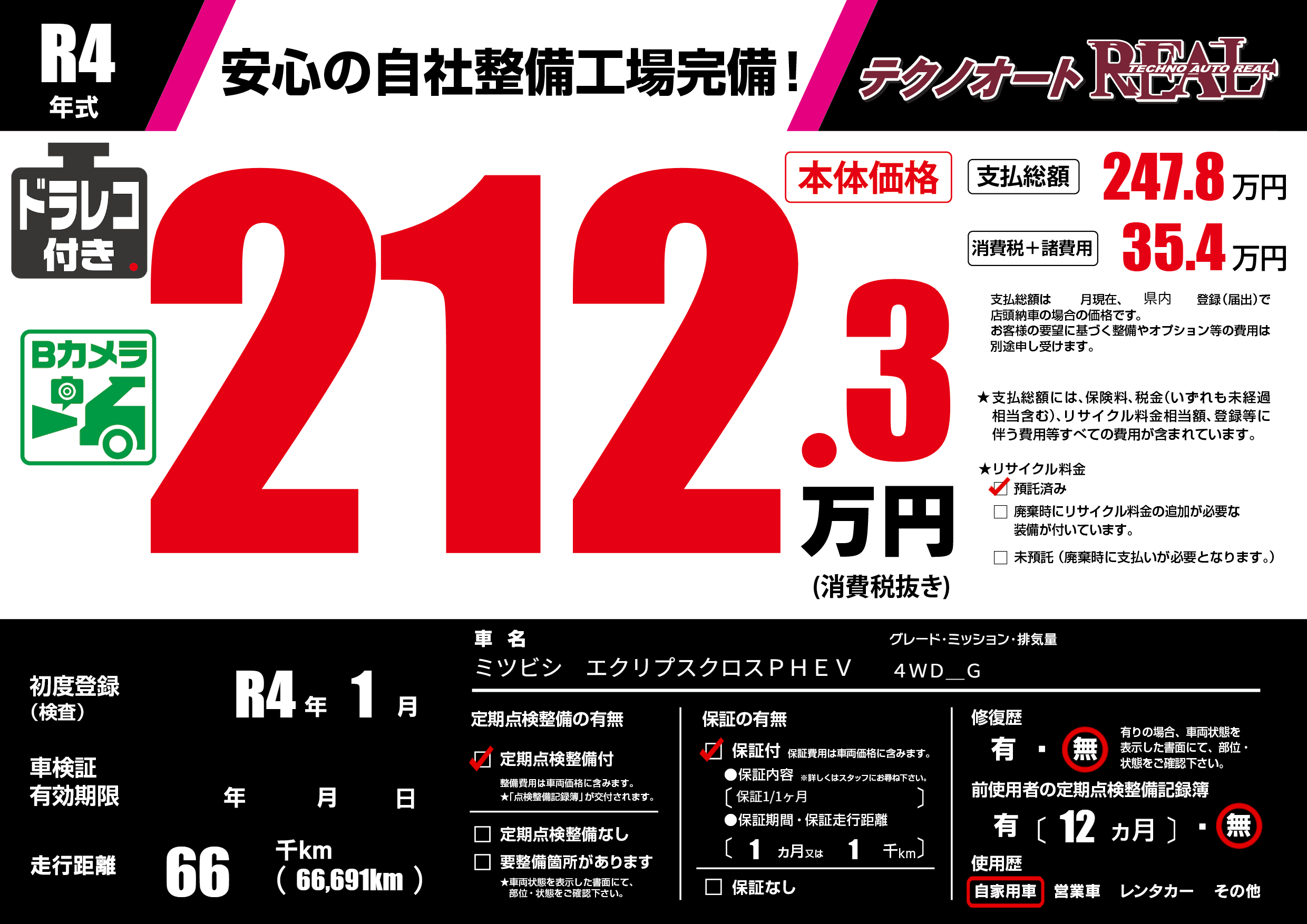 | 車名 | ミツビシ エクリプスクロスPHEV | グレード ミッション 排気量 |