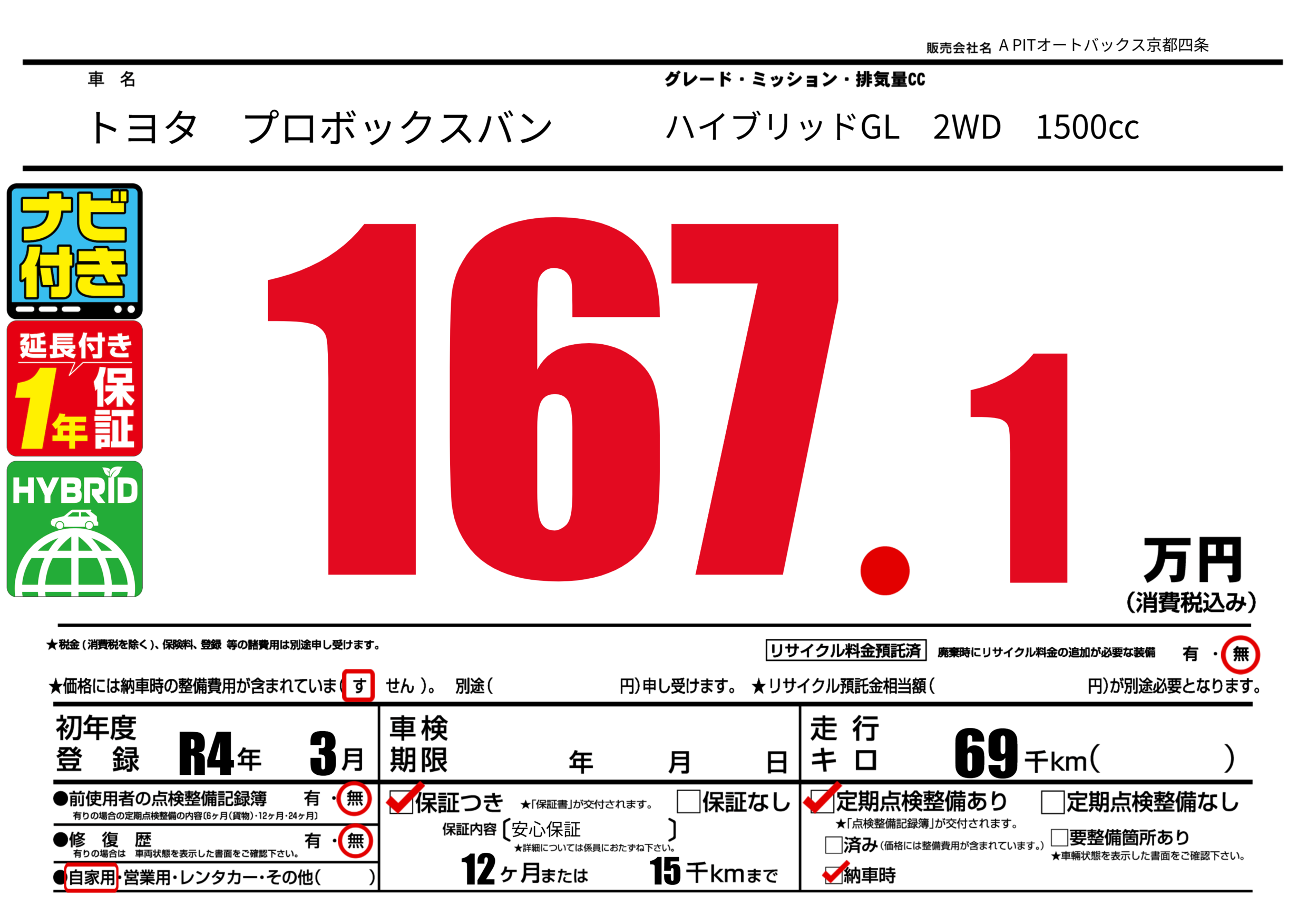 | 車名 | トヨタ プロボックスバン | グレード ミッション 排気量 |