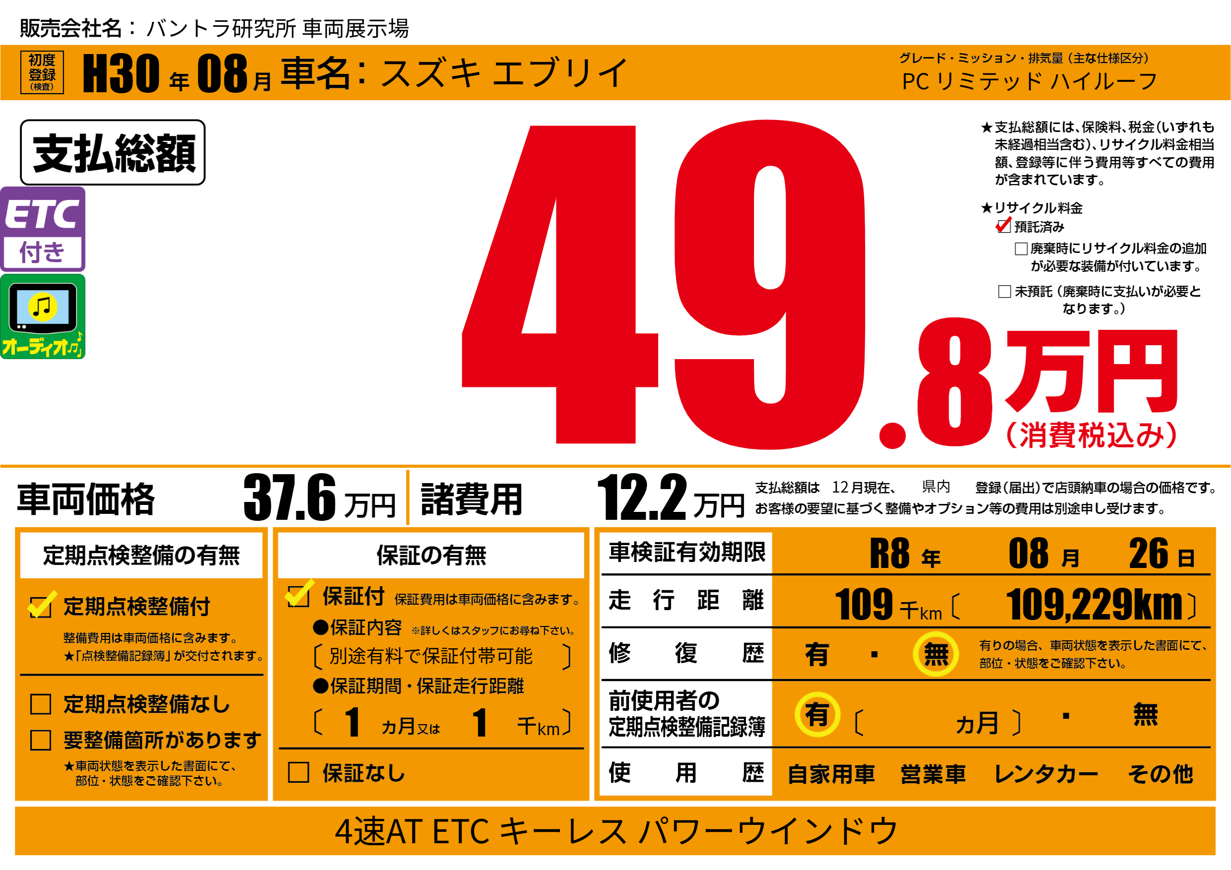 | 走行キロ | 10.9万km | 初年度登録 | H30年08月 |