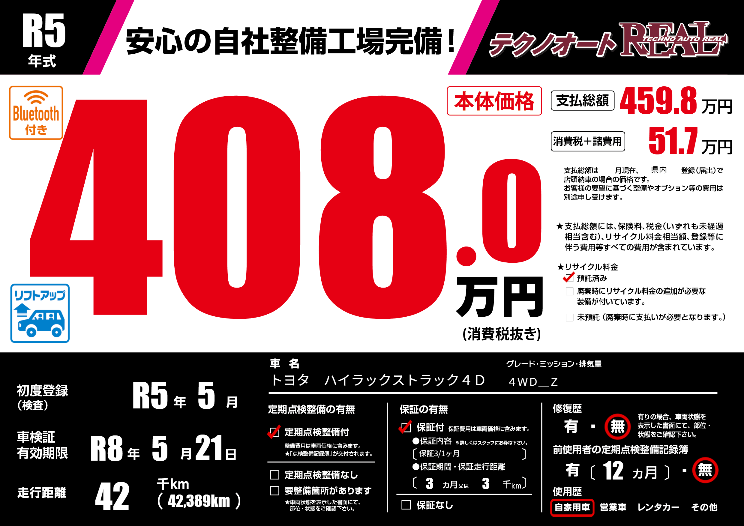 | 走行キロ | 4.2万km | 初年度登録 | R5年5月 |