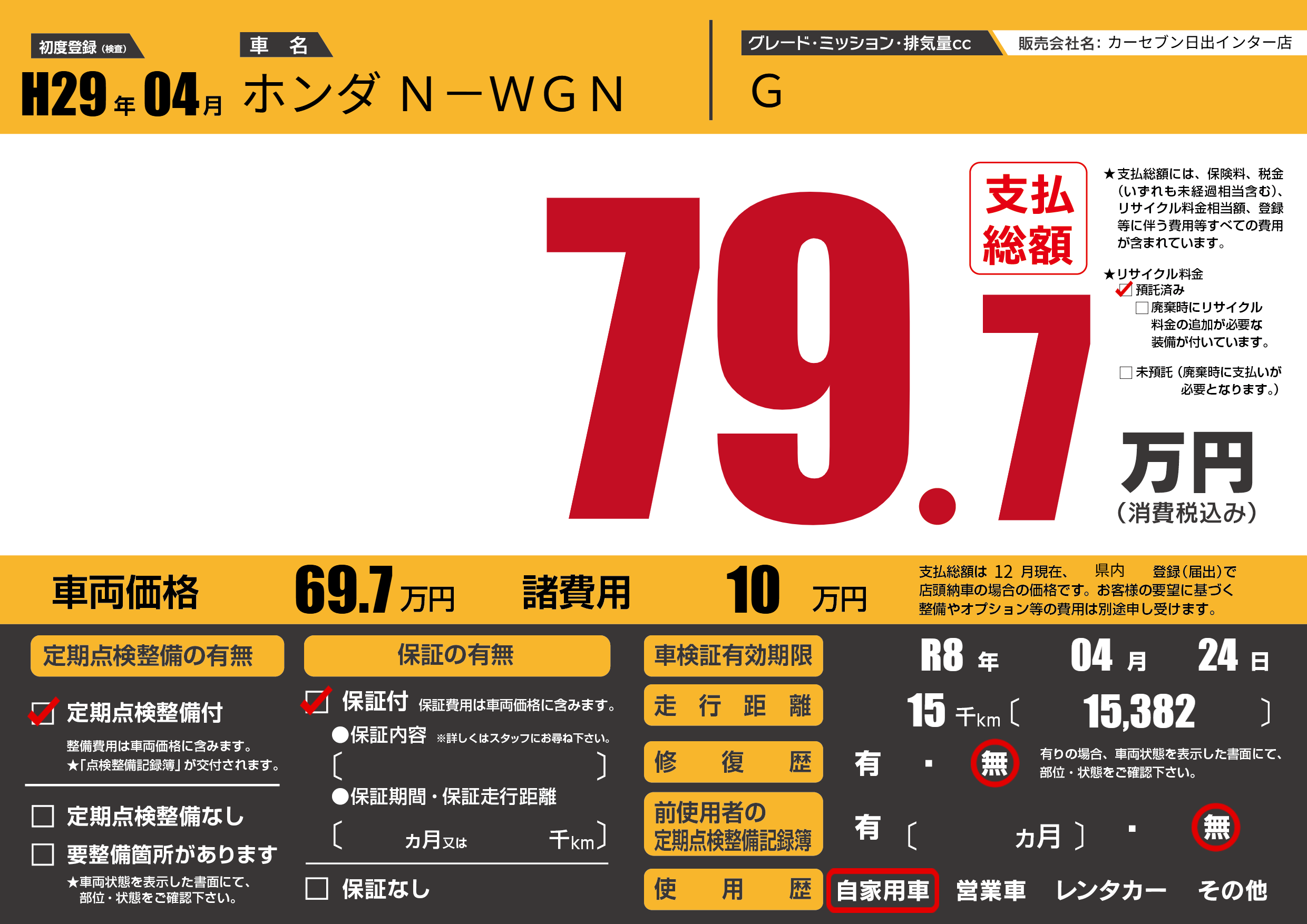 | 車名 | ホンダ N-WGN | グレード ミッション 排気量 |