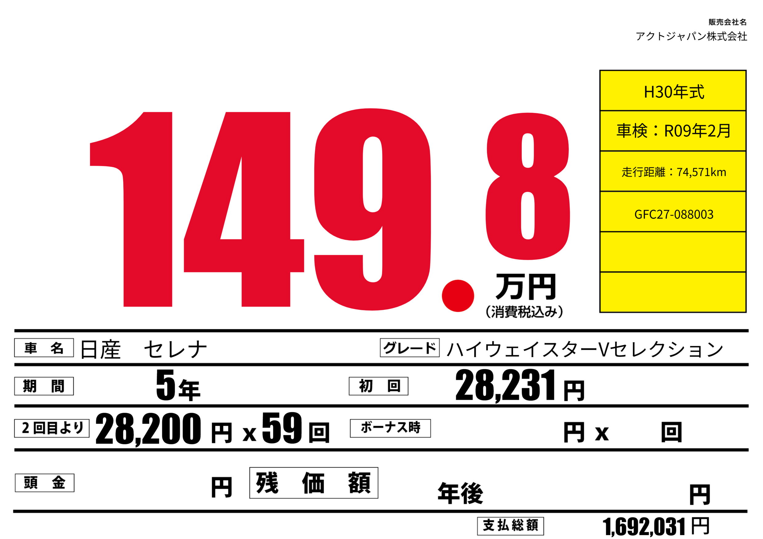| 車名 | 日産 セレナ | グレード ミッション 排気量 |