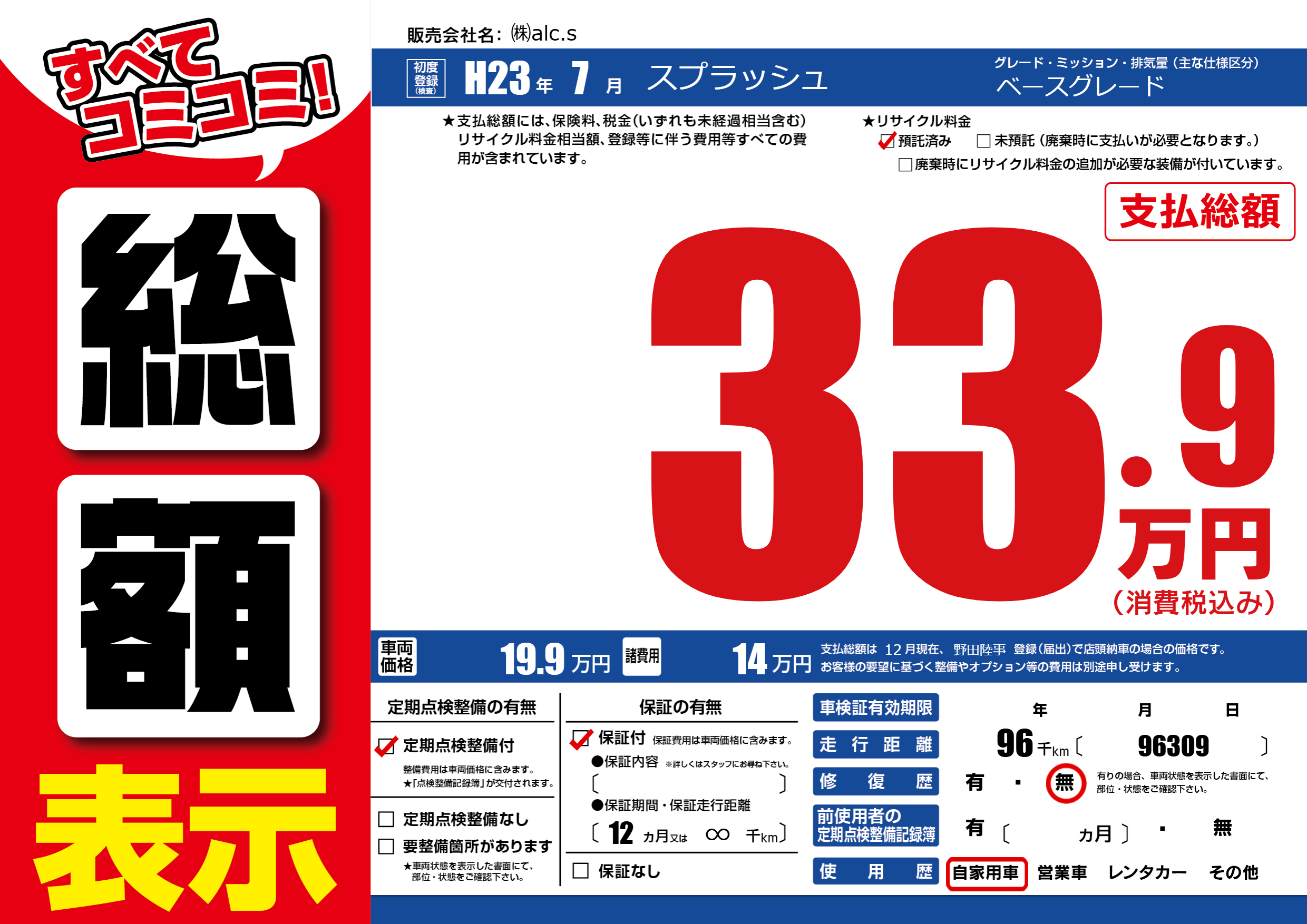 | 走行キロ | 9.6万km | 初年度登録 | H23年7月 |