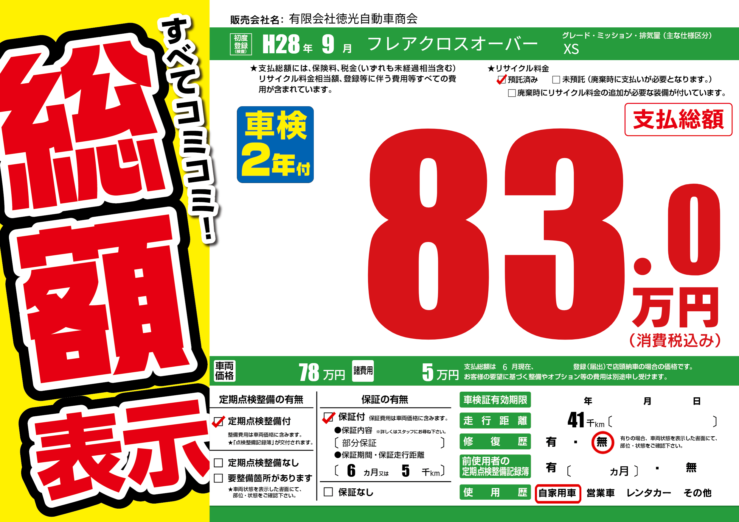 | 走行キロ | 4.1万km | 初年度登録 | H28年9月 |