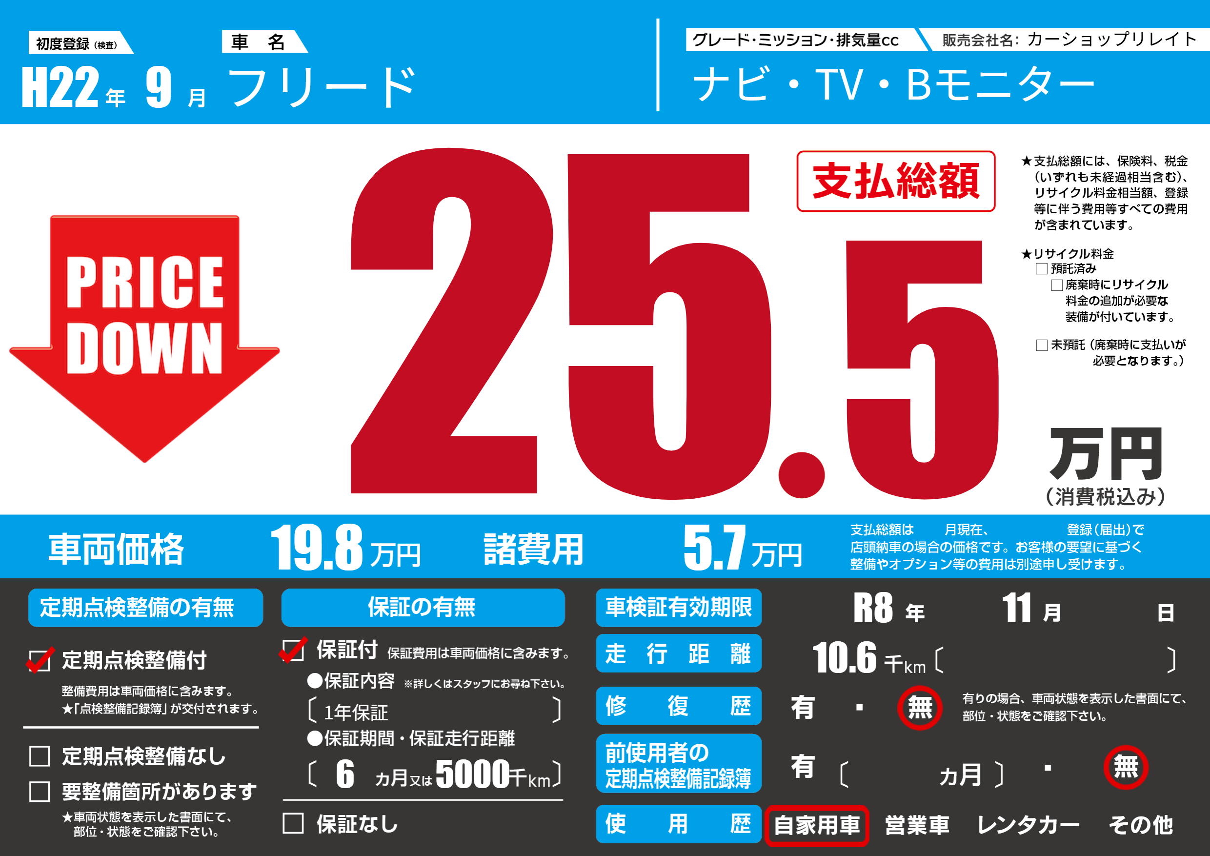 | 走行キロ | 1万km | 初年度登録 | H22年9月 |