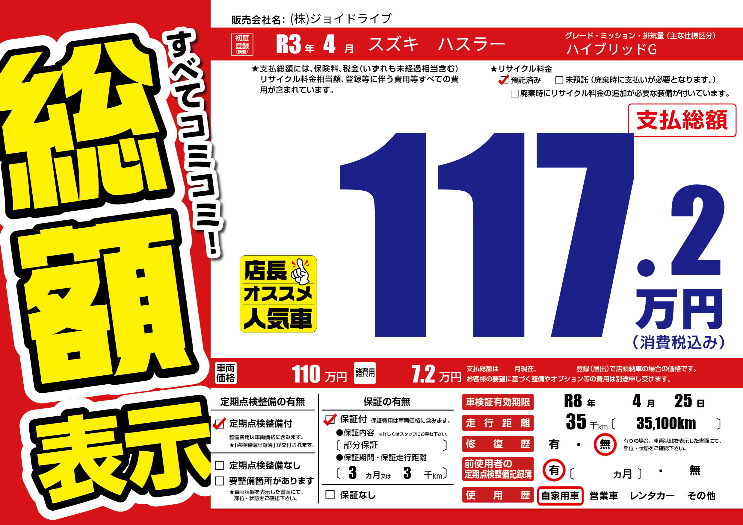 | 車名 | スズキ ハスラー | グレード ミッション 排気量 |