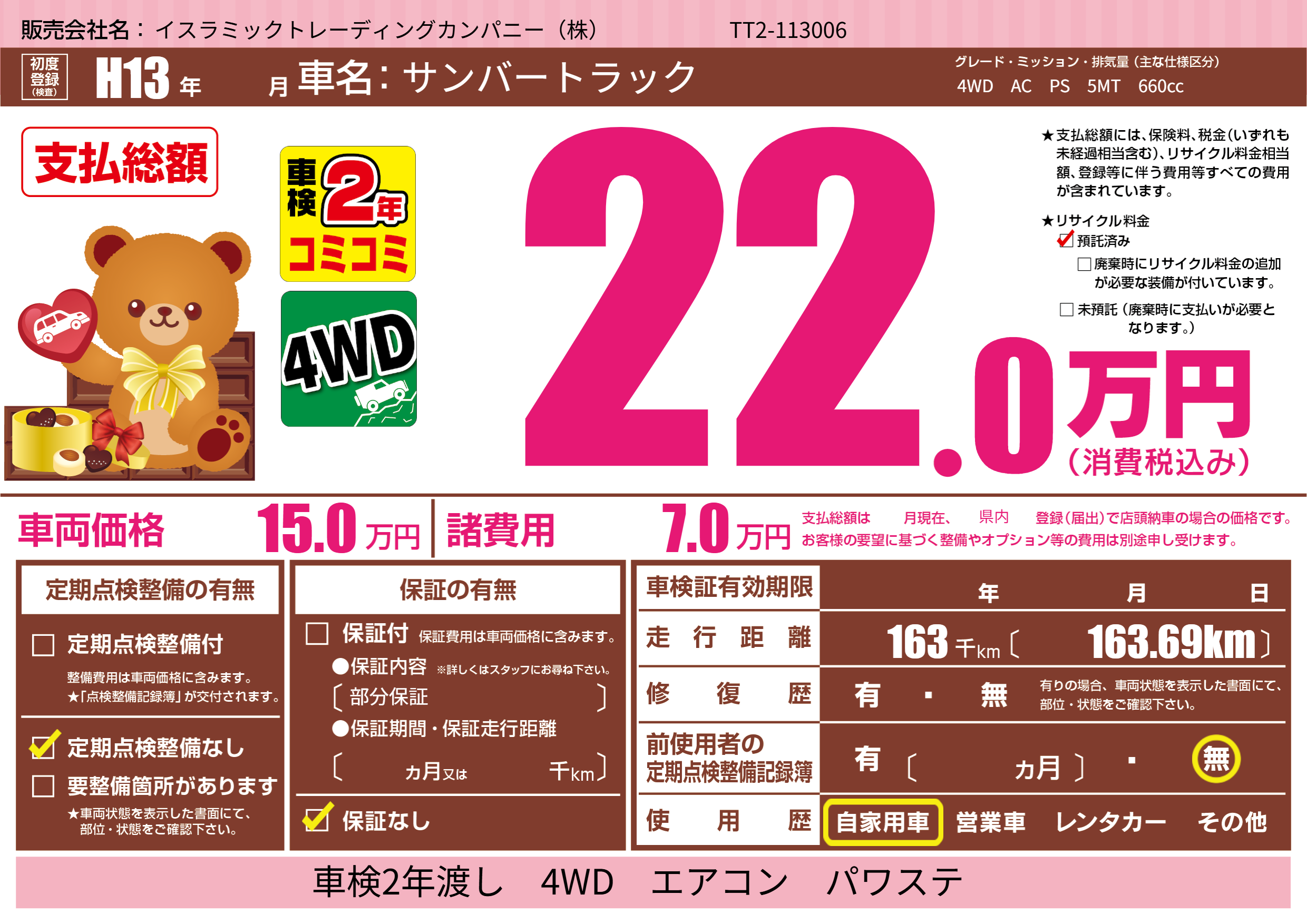 | 車名 | サンバートラック | グレード ミッション 排気量 |