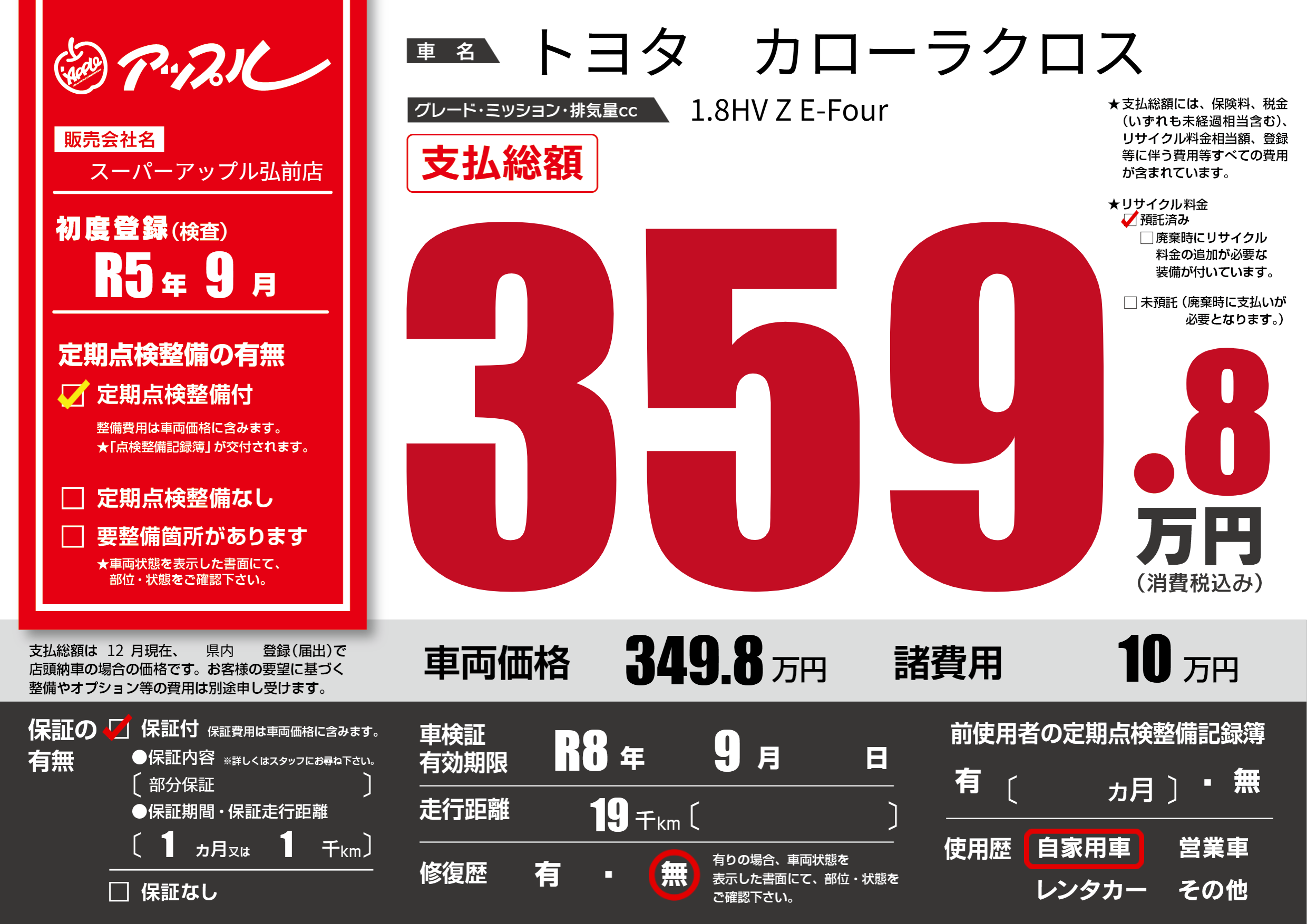 | 走行キロ | 1.9万km | 初年度登録 | R5年9月 |