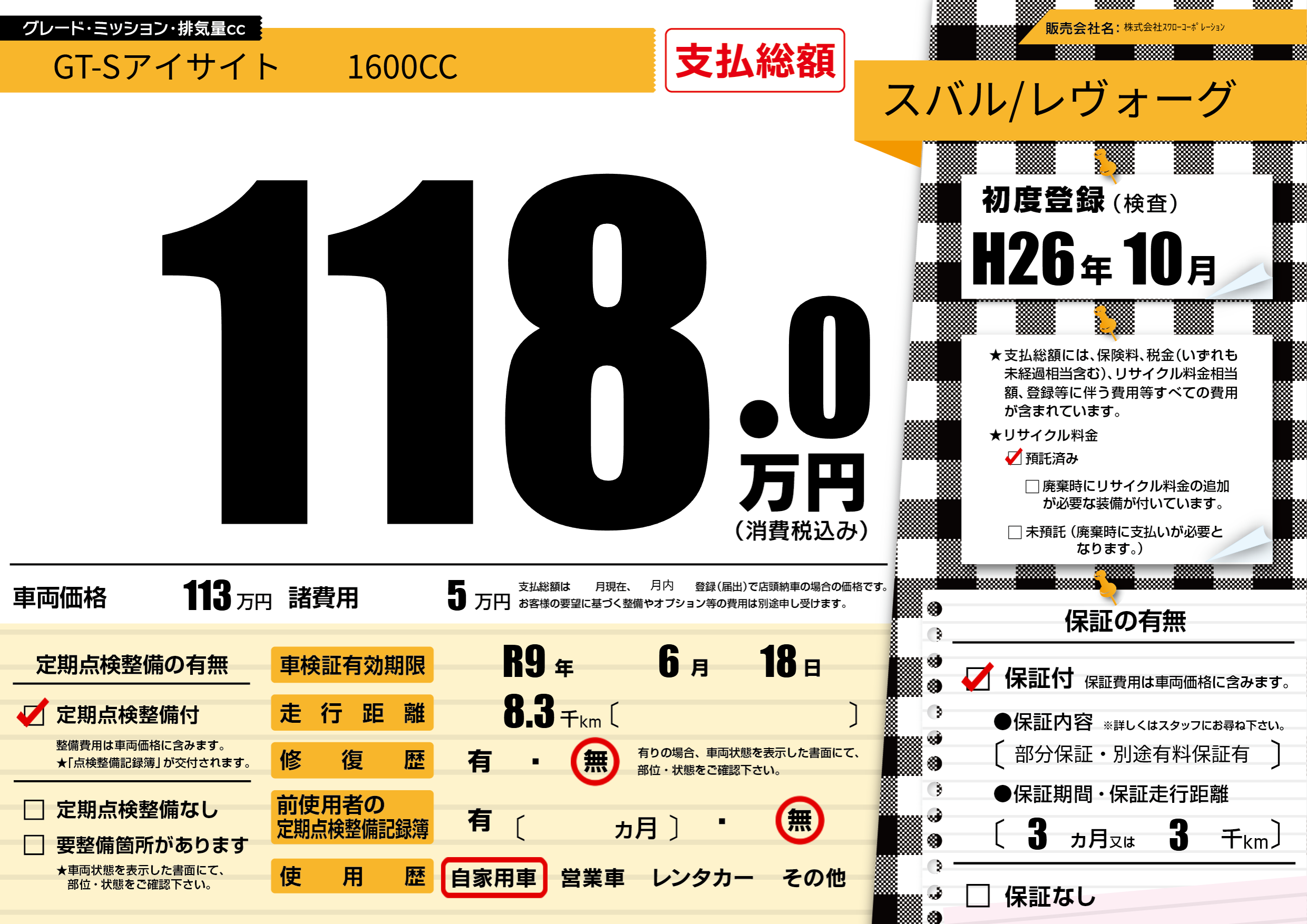 | 車名 | スバル/レヴォーグ | グレード ミッション 排気量 |