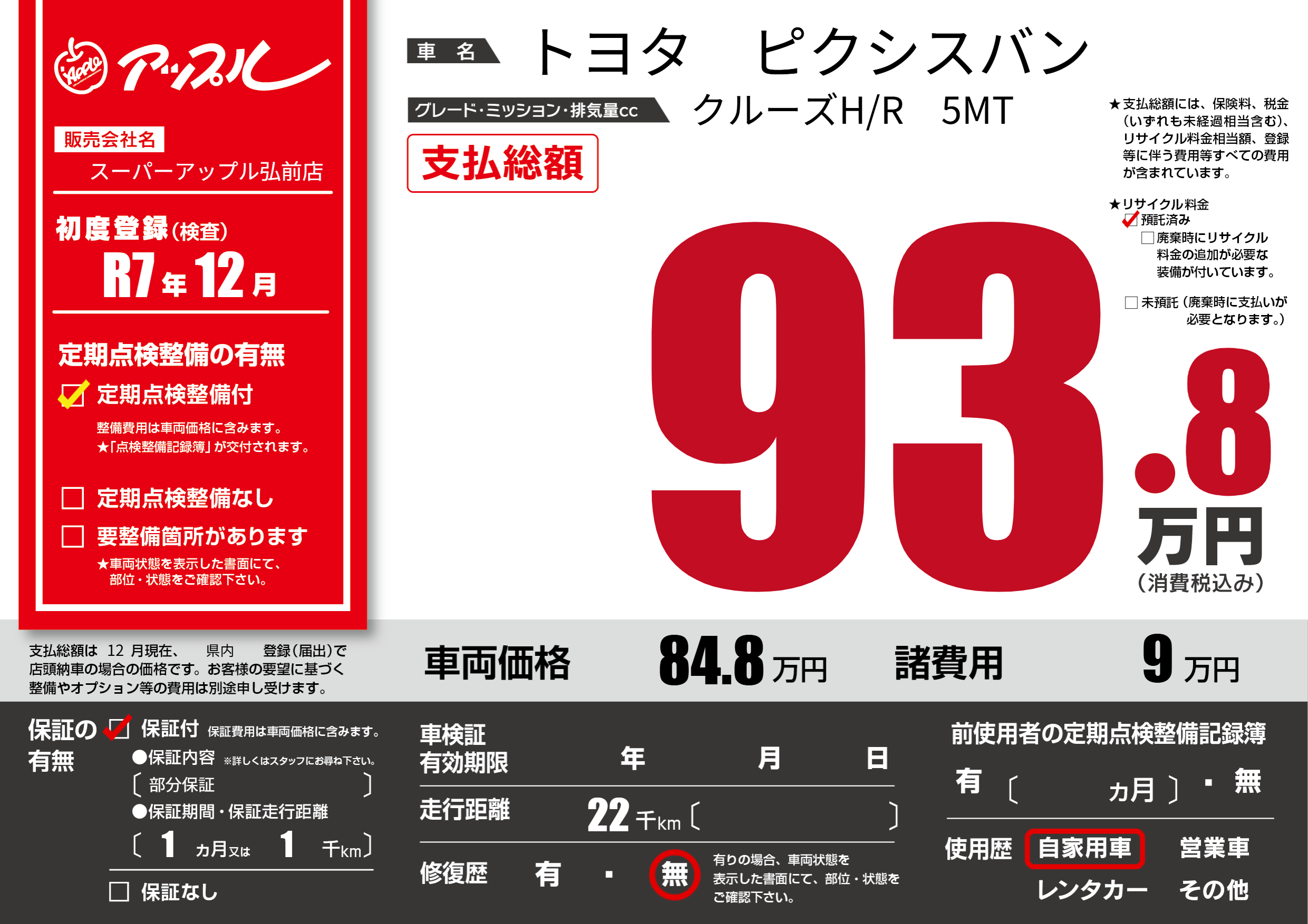 | 走行キロ | 2.2万km | 初年度登録 | R7年12月 |