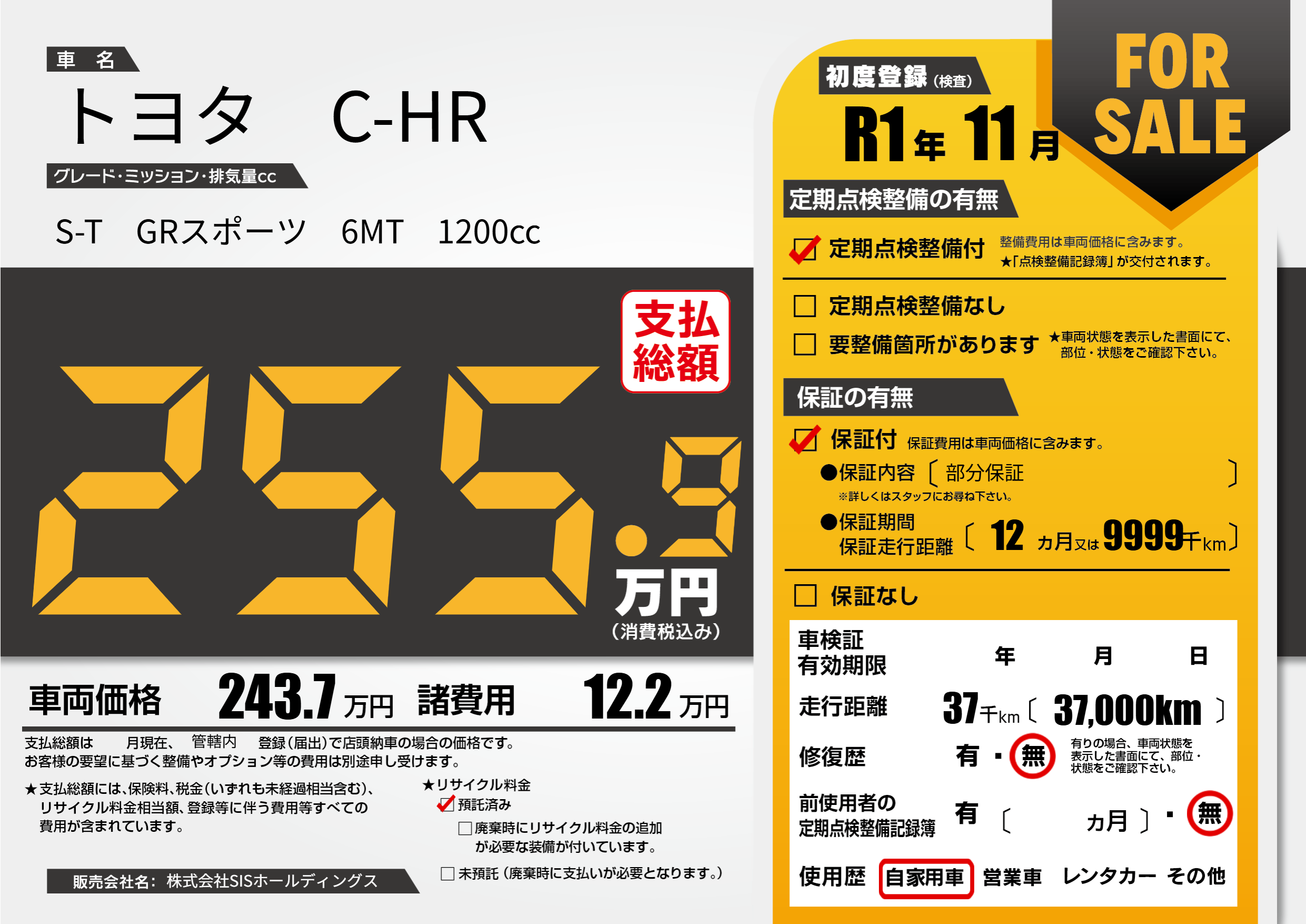 | 車名 | トヨタ C-HR | グレード ミッション 排気量 |