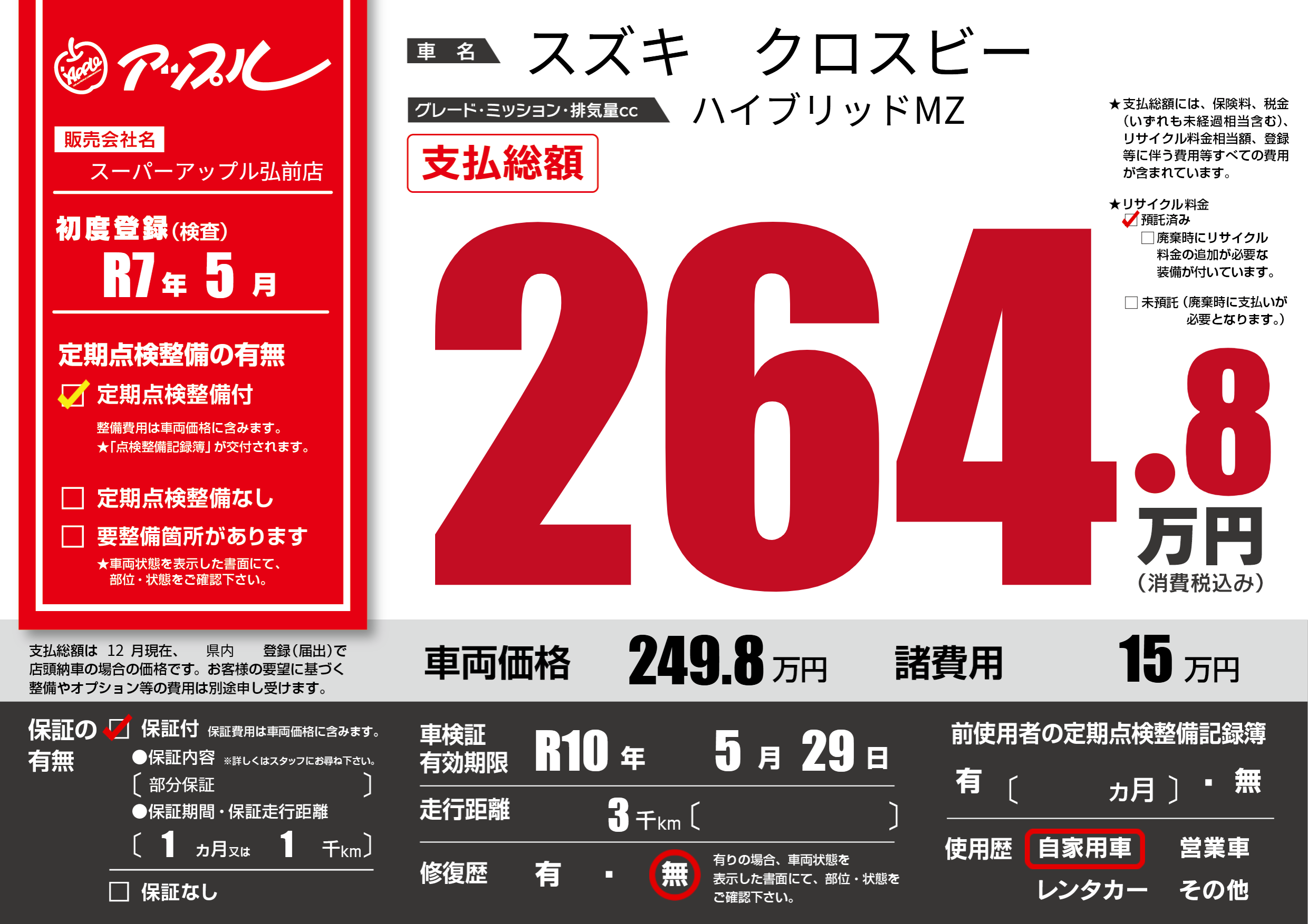 | 走行キロ | 0.3万km | 初年度登録 | R7年5月 |