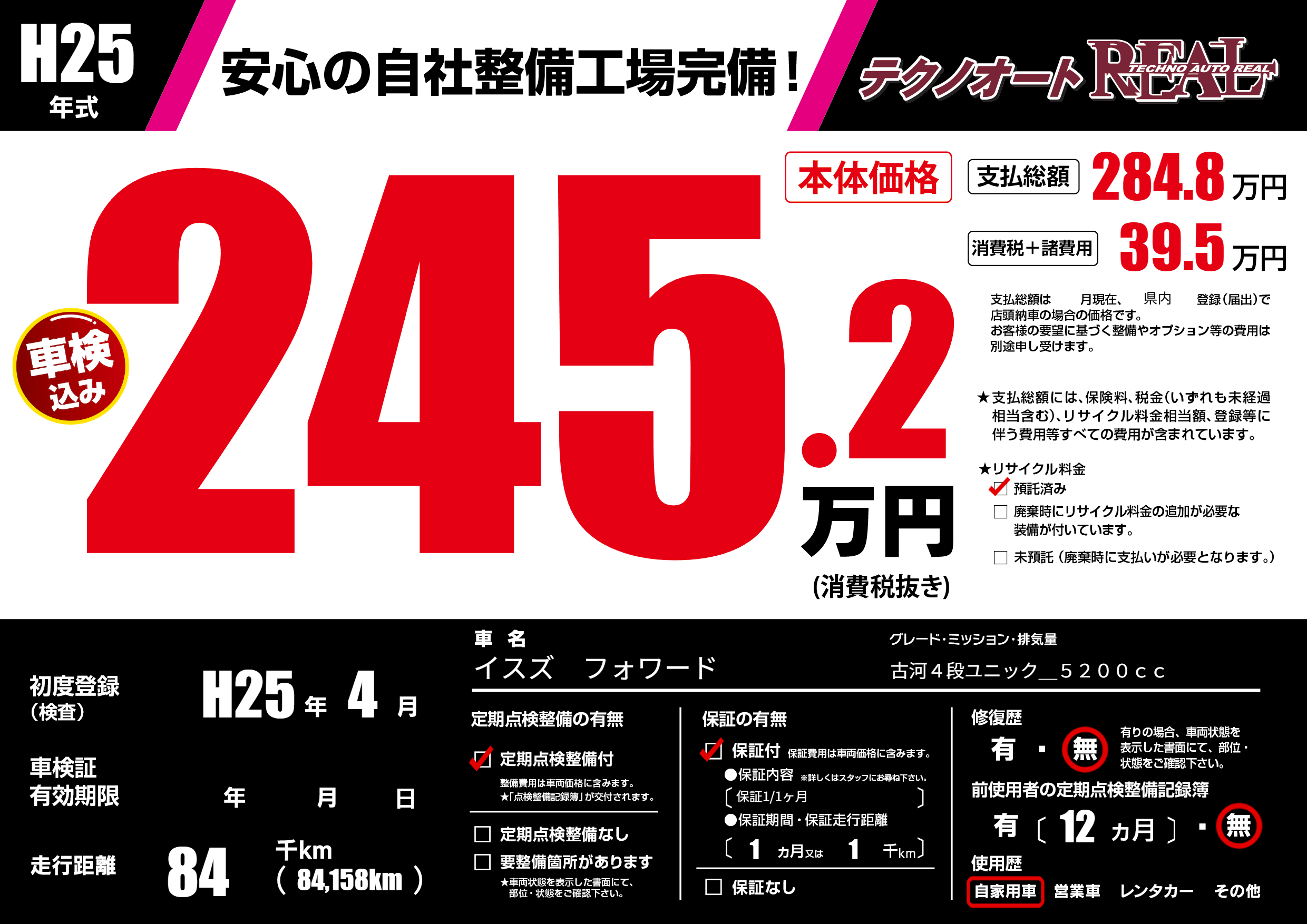 | 走行キロ | 8.4万km | 初年度登録 | H25年4月 |