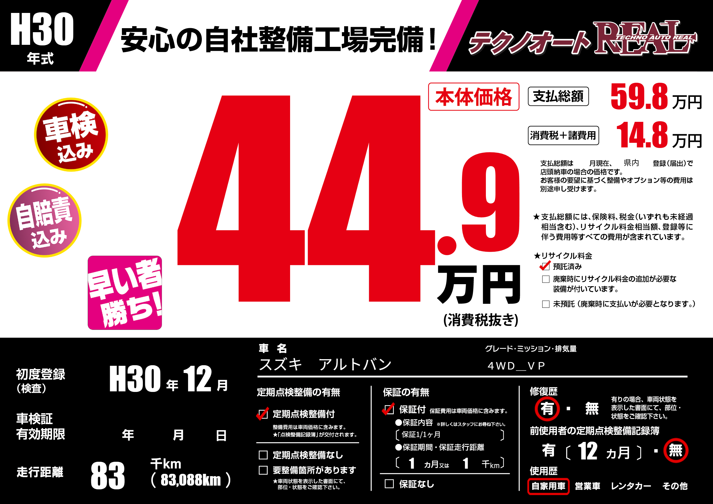 | 走行キロ | 8.3万km | 初年度登録 | H30年12月 |