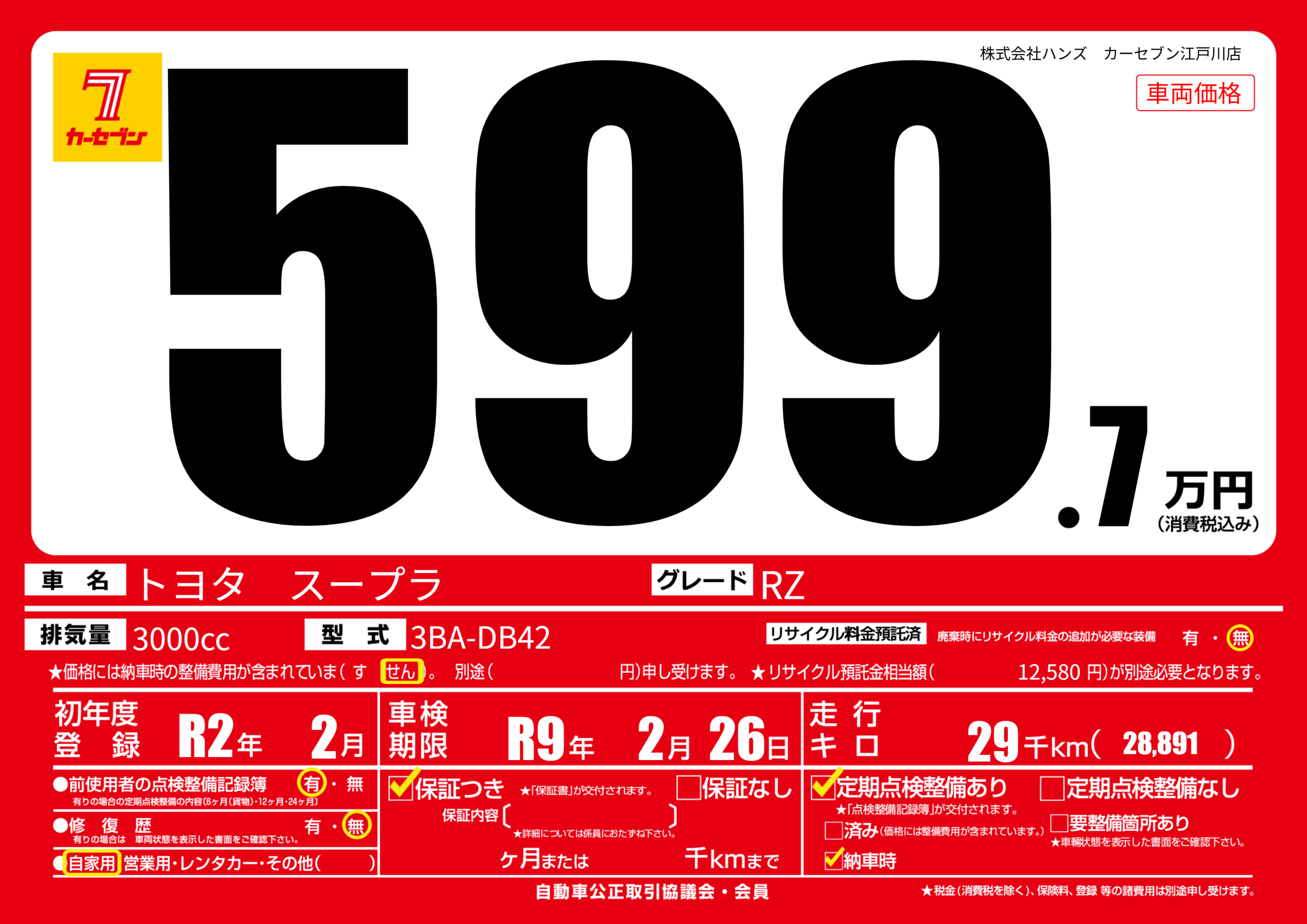 | 車名 | トヨタ スープラ | グレード ミッション 排気量 |