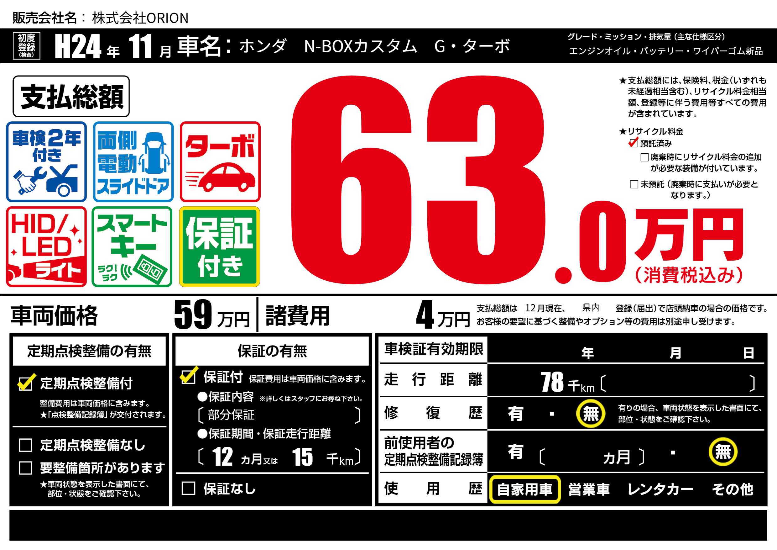 | 走行キロ | 7.8万km | 初年度登録 | H24年11月 |
