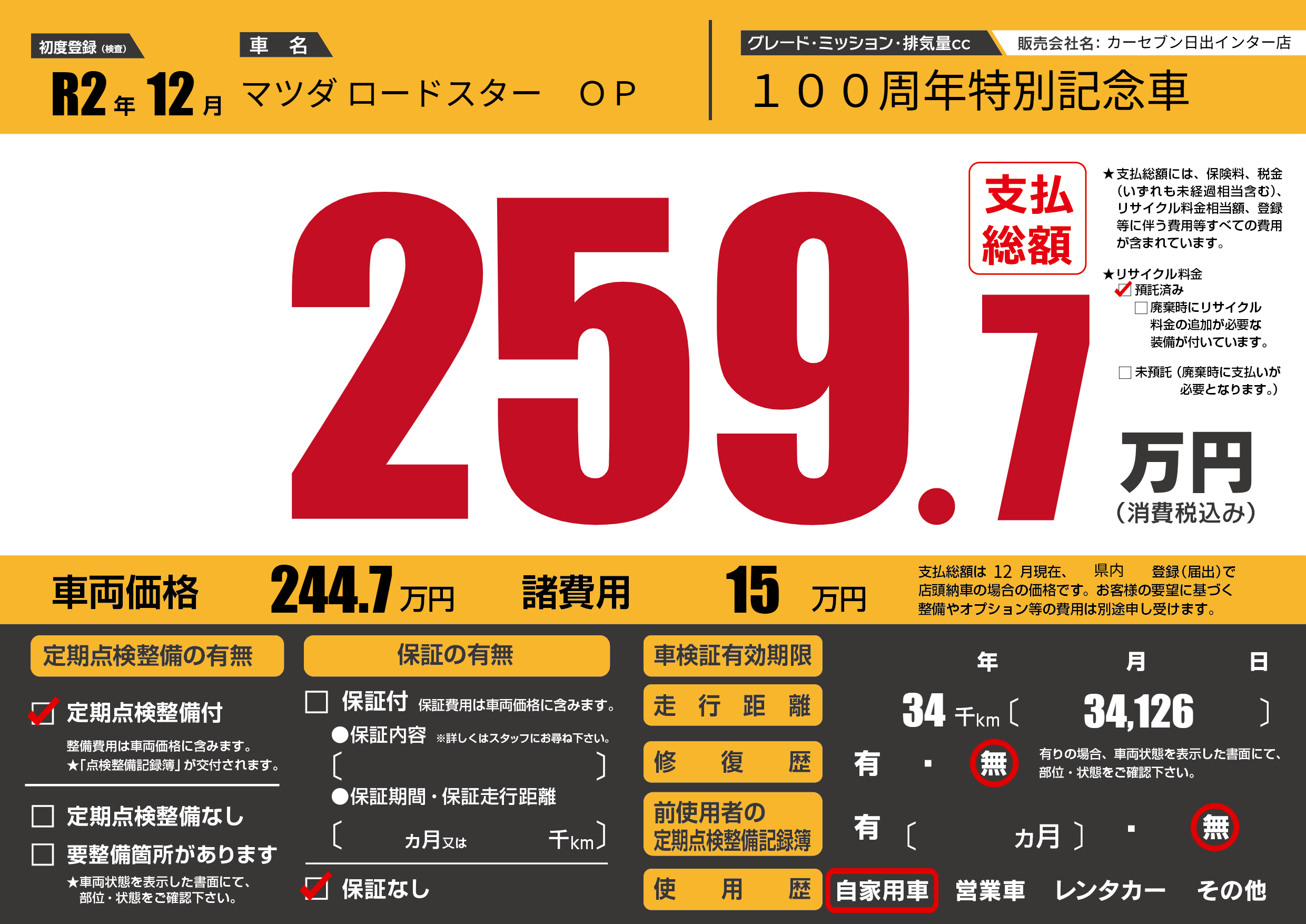 | 車名 | マツダ ロードスター OP | グレード ミッション 排気量 |
