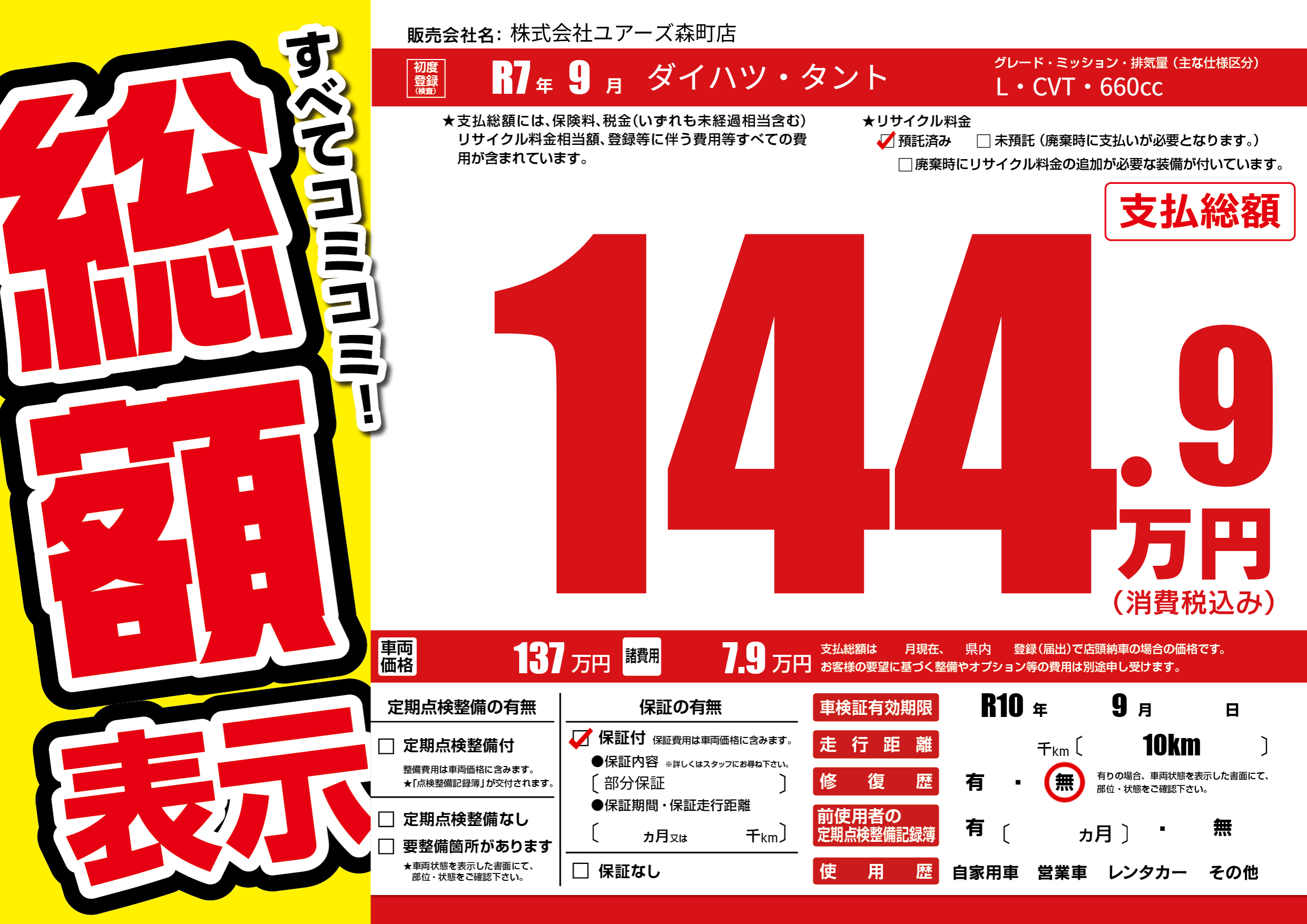 なし | 車検制限 | R10年9月---月 |