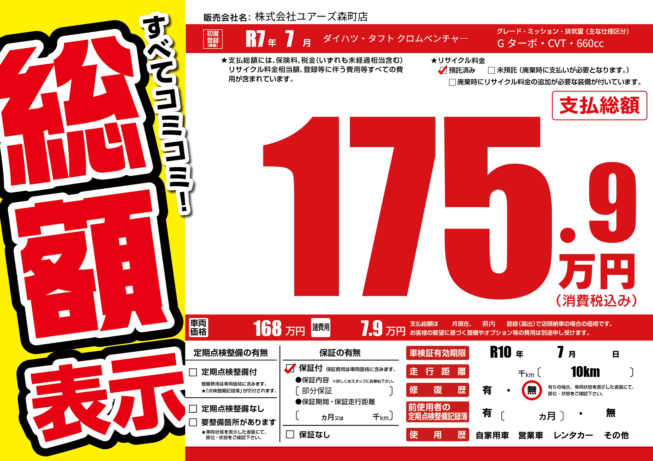 | 走行キロ | - | 初年度登録 | R7年7月 |