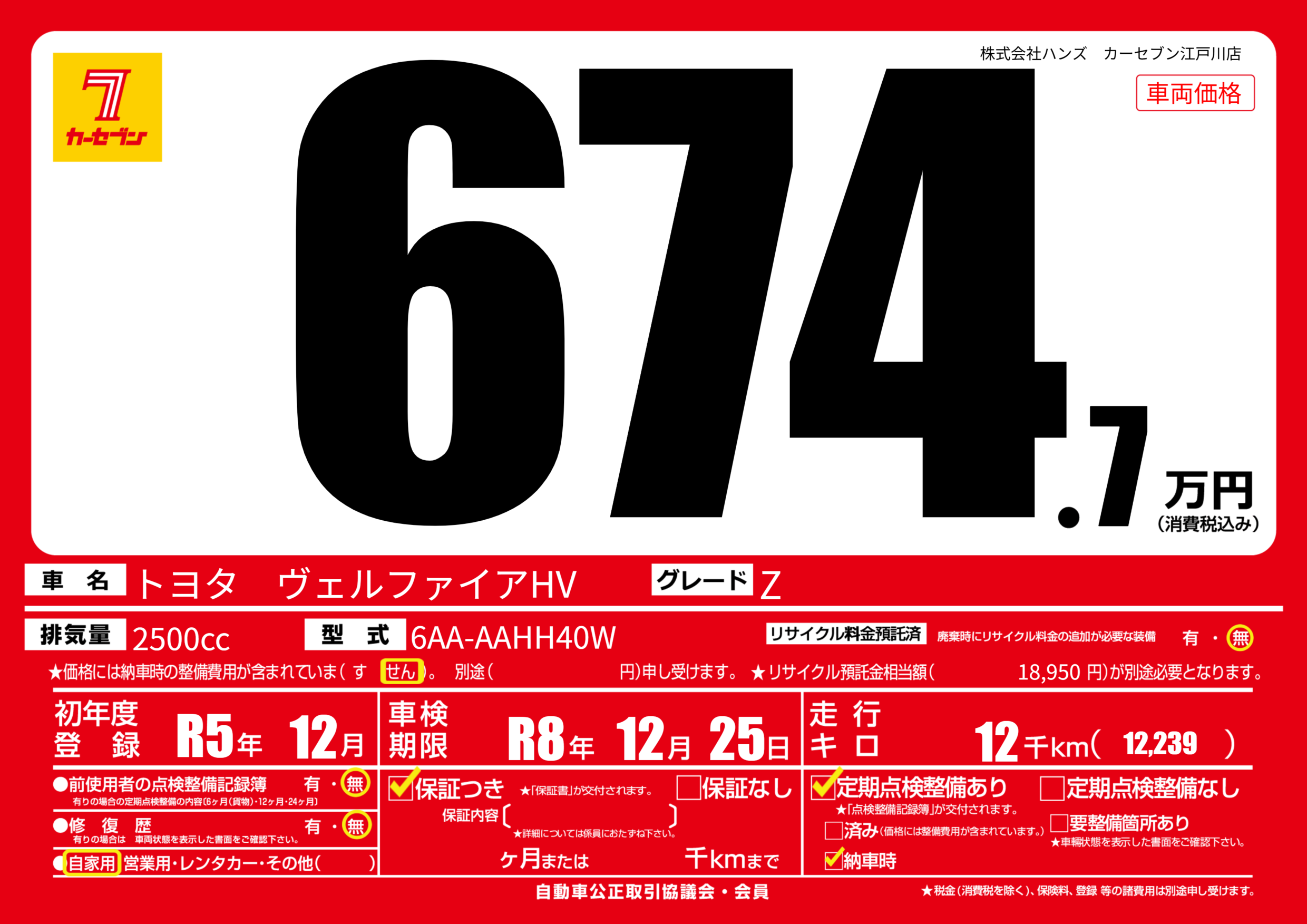 | 走行キロ | 1.2万km | 初年度登録 | R5年12月 |