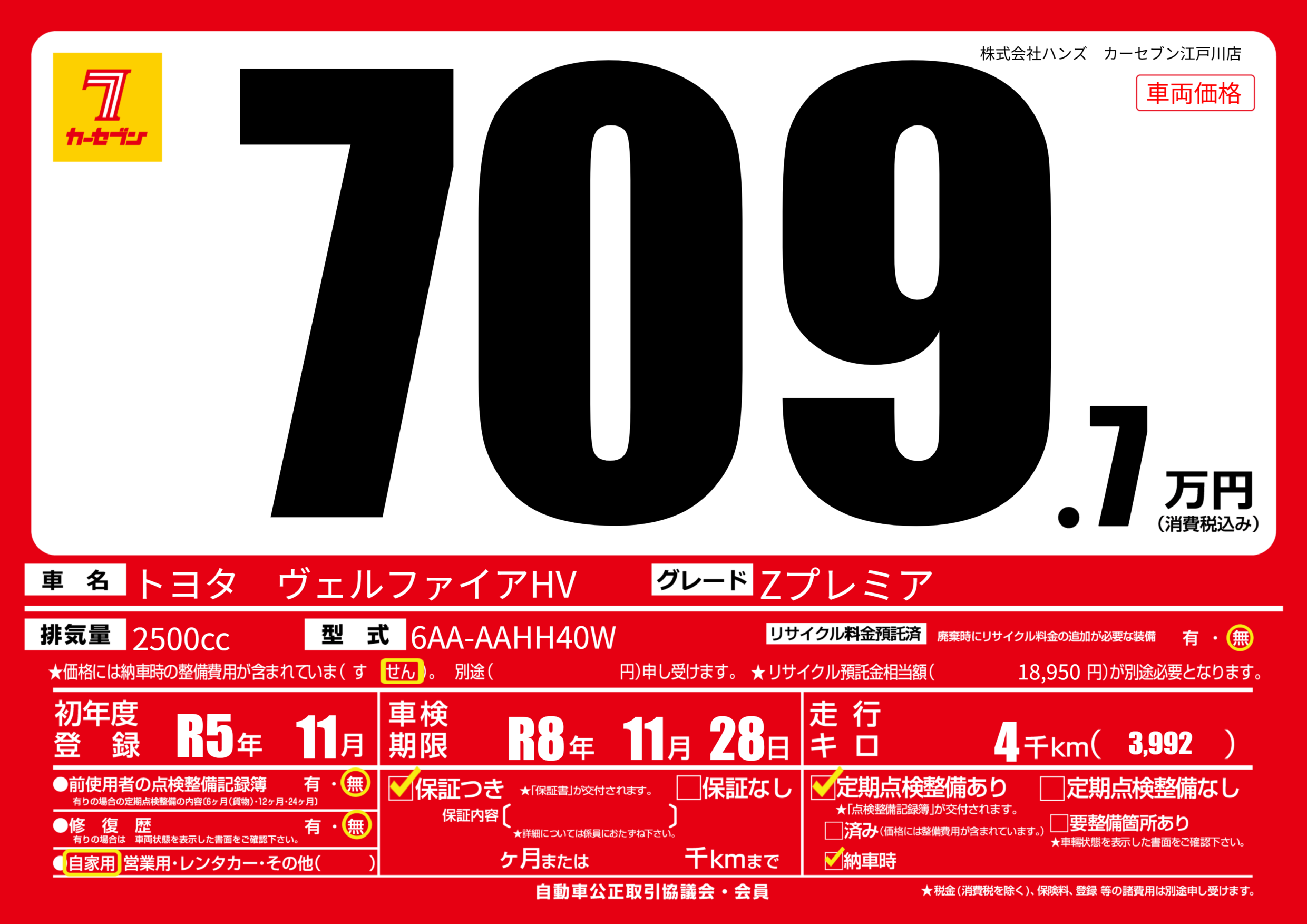 | 走行キロ | 0.4万km | 初年度登録 | R5年11月 |