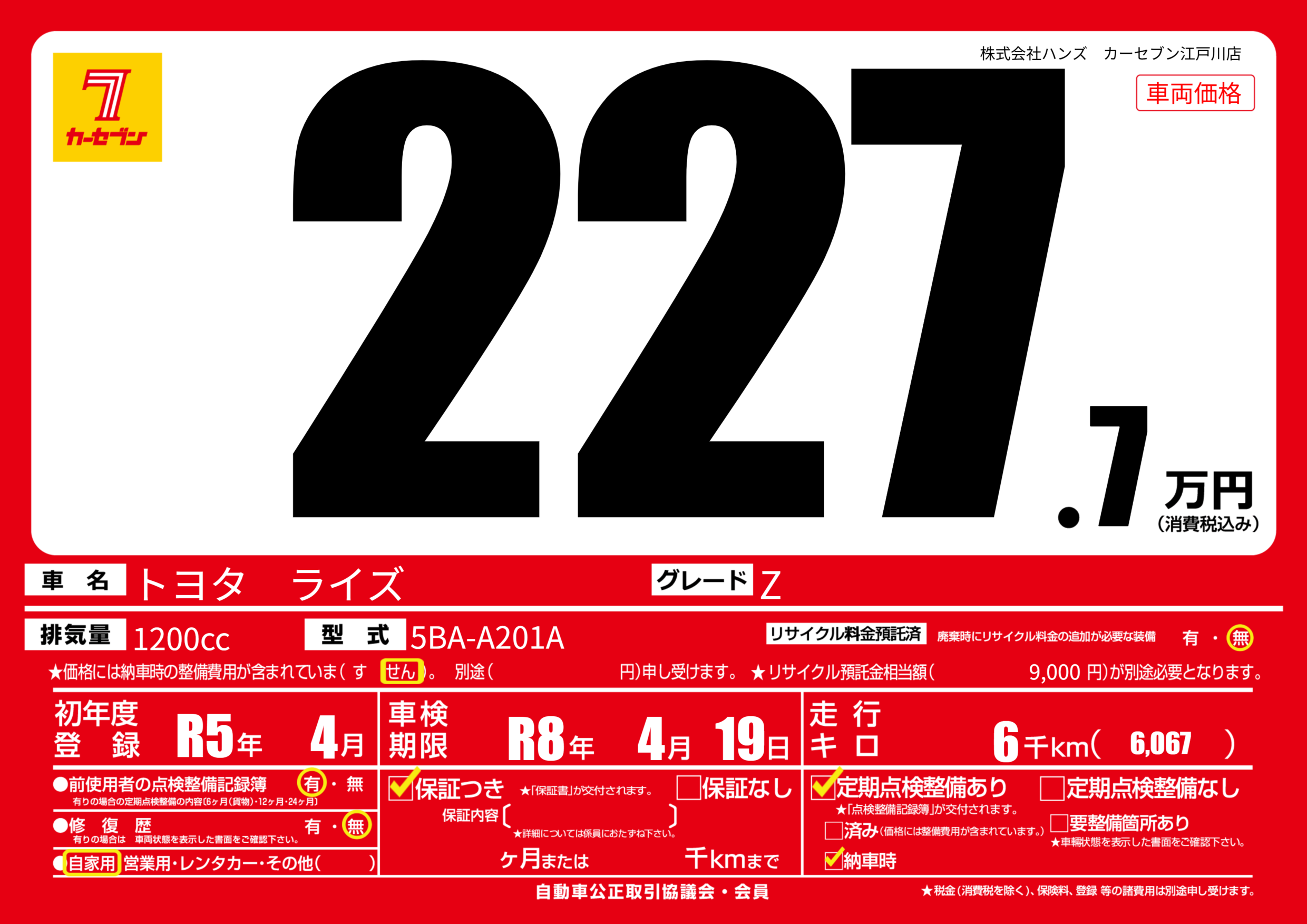 | 走行キロ | 0.6万km | 初年度登録 | R5年4月 |
