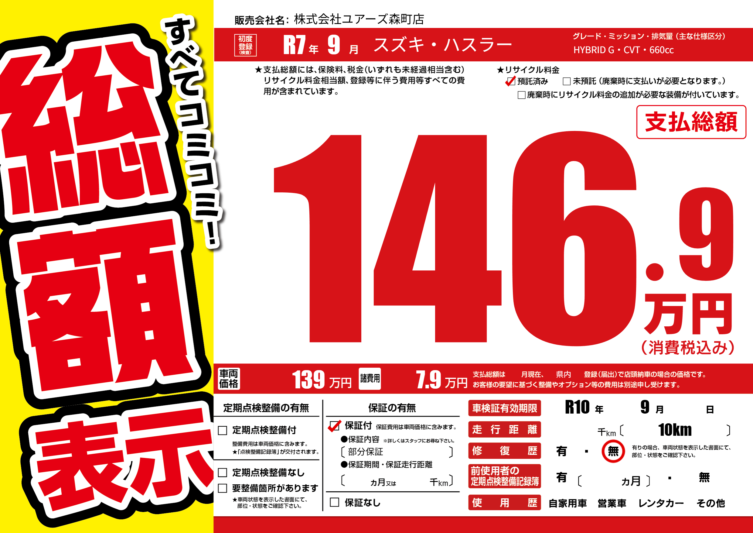 | 走行キロ | - | 初年度登録 | R7年9月 |
