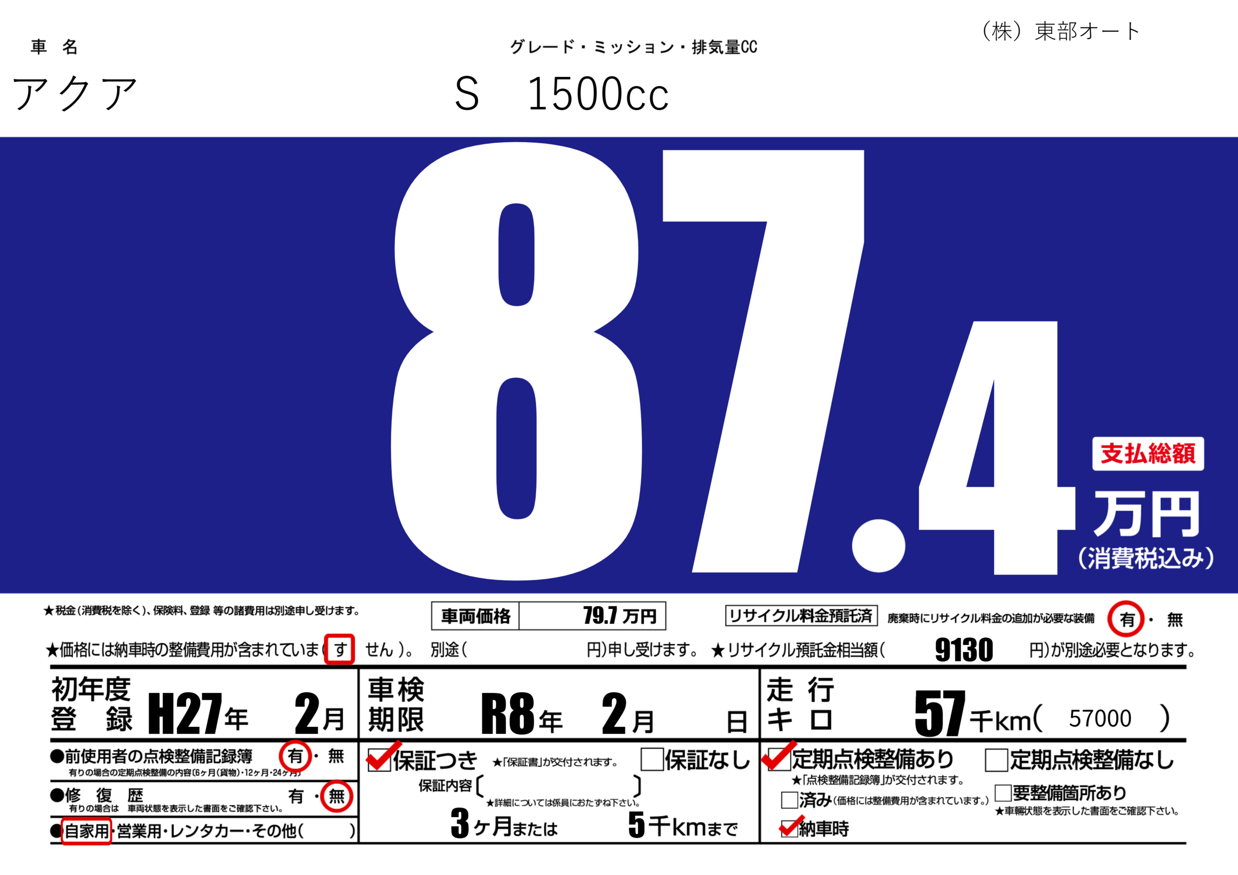 | 定期点検整備 | 定期点検整備あり 納車時あり | ||