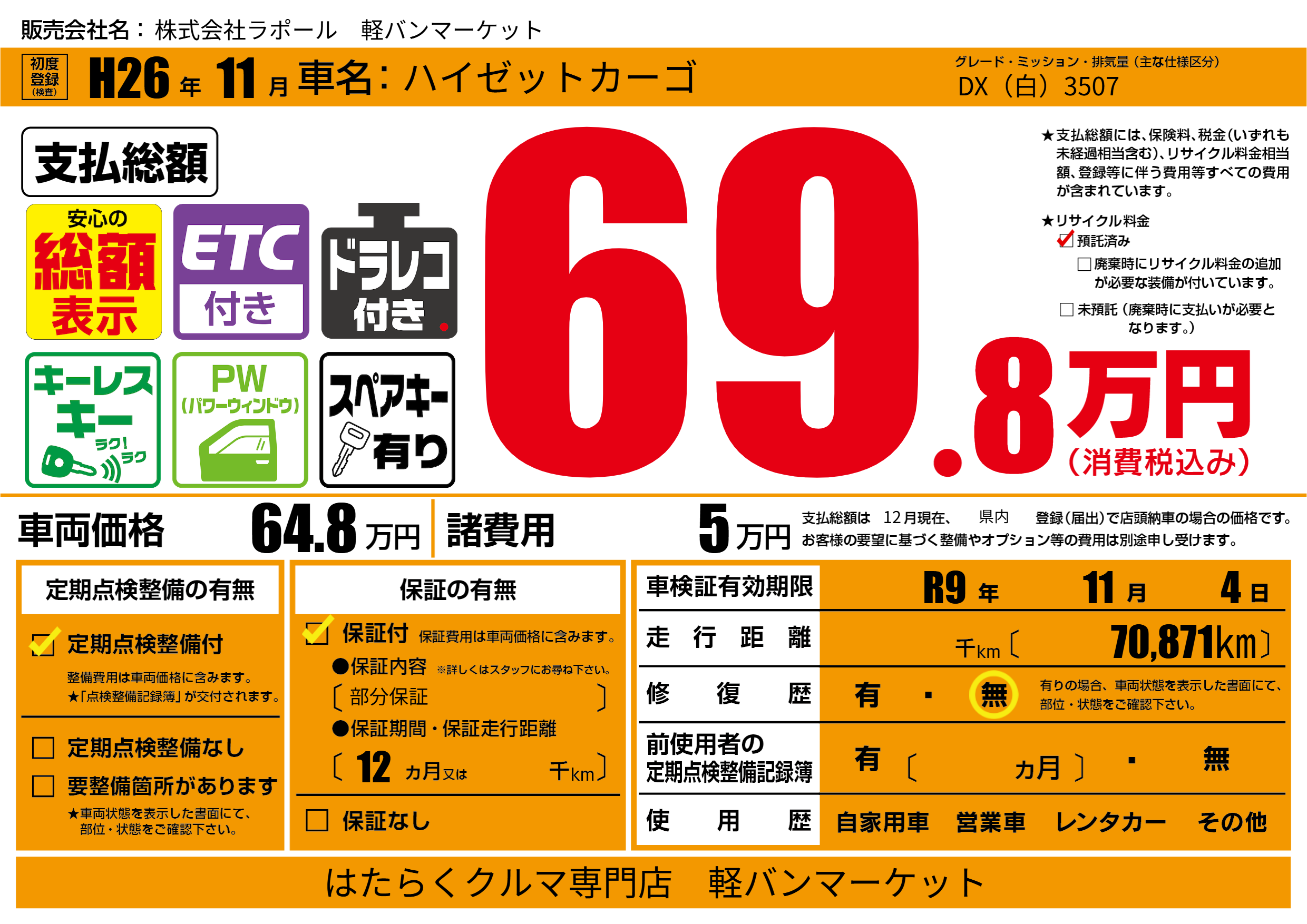 | 車検制限 | R9年 11月 4日 | ||
