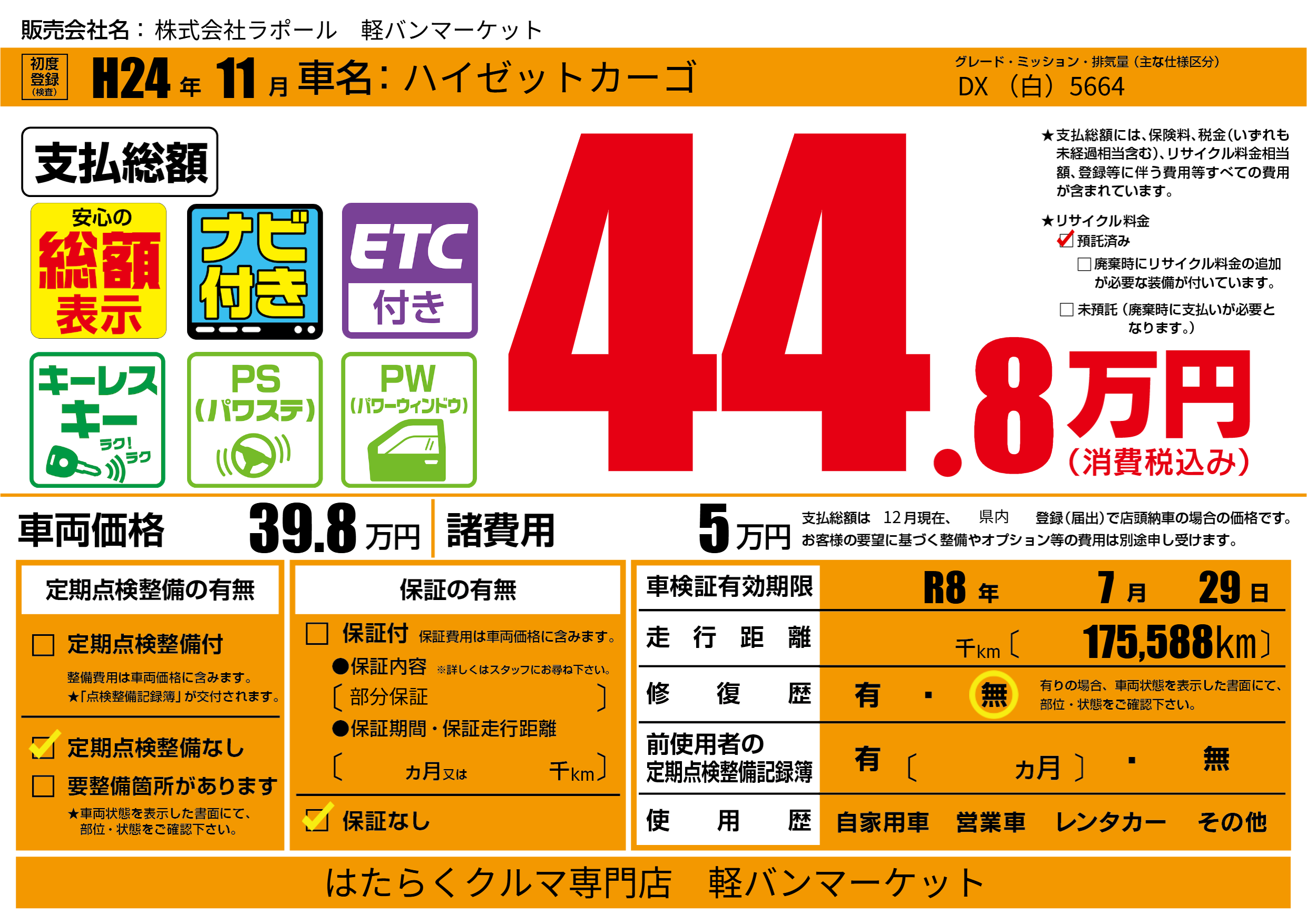 | 走行キロ | - | 初年度登録 | H24年11月 |