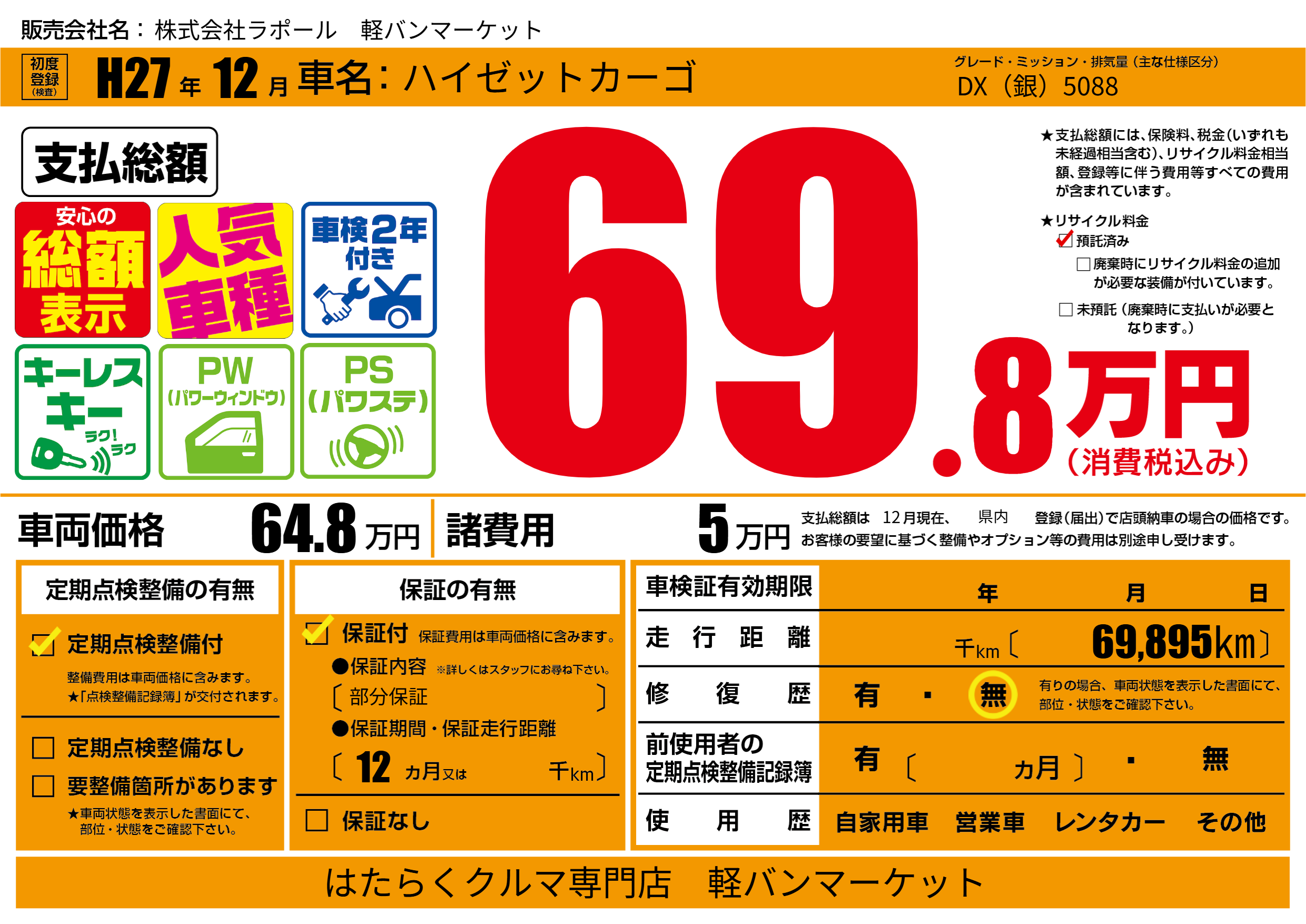 保証付き 保証内容(部分保証) 12ヶ月または()千kmまで |