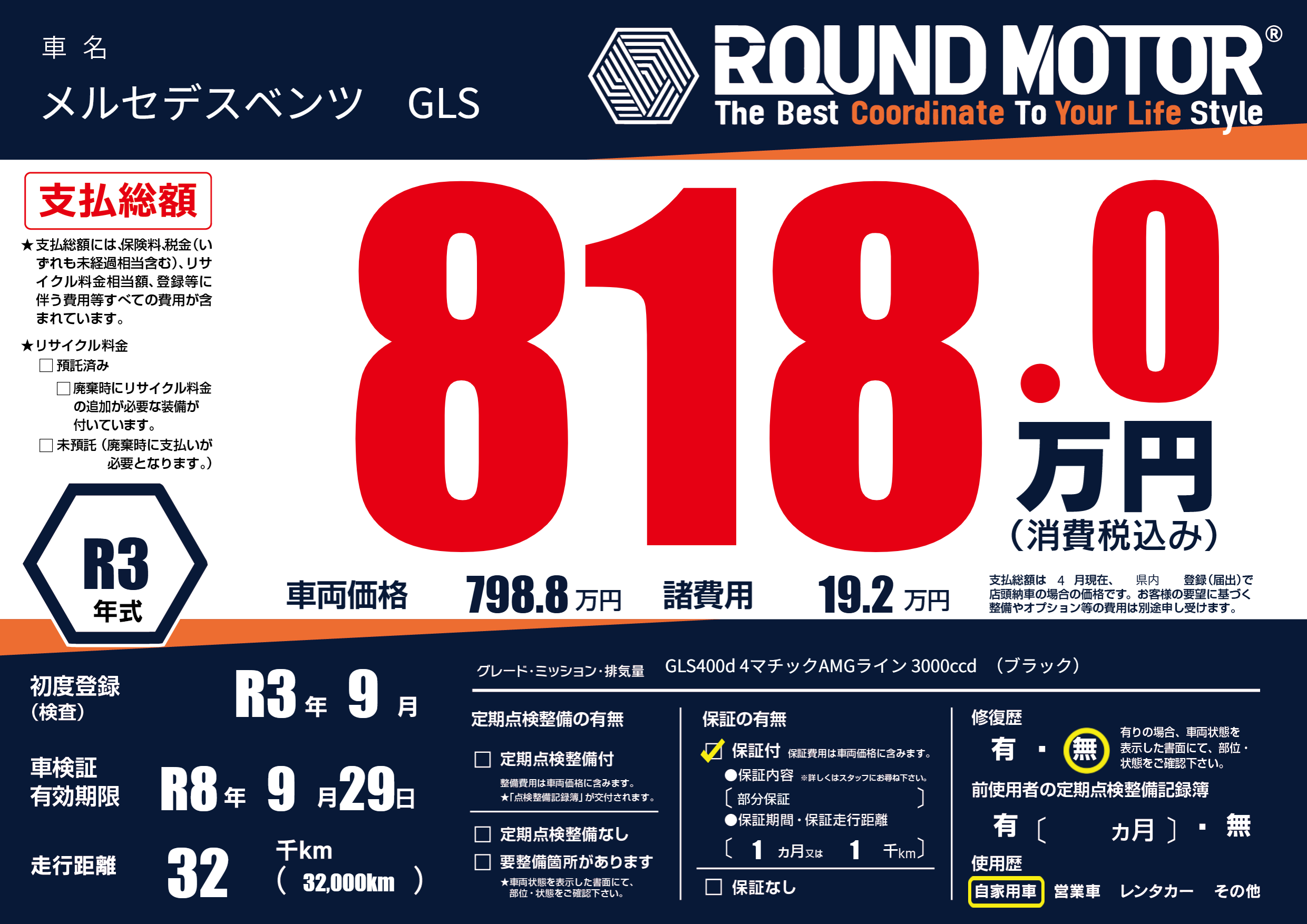 | 車名 | メルセデスベンツ GLS | グレード ミッション 排気量 |
