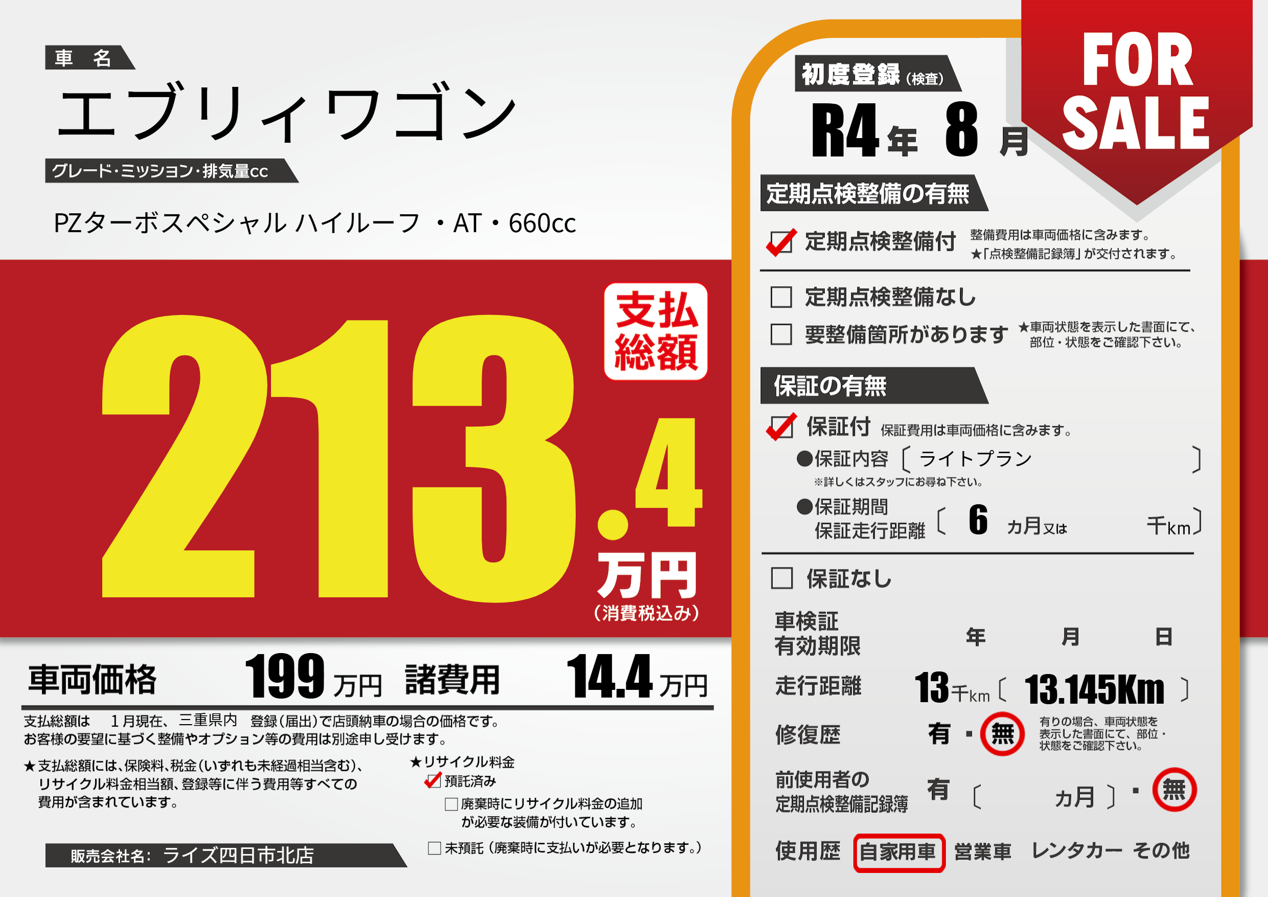 | 初年度登録 | R4年8月 | ||