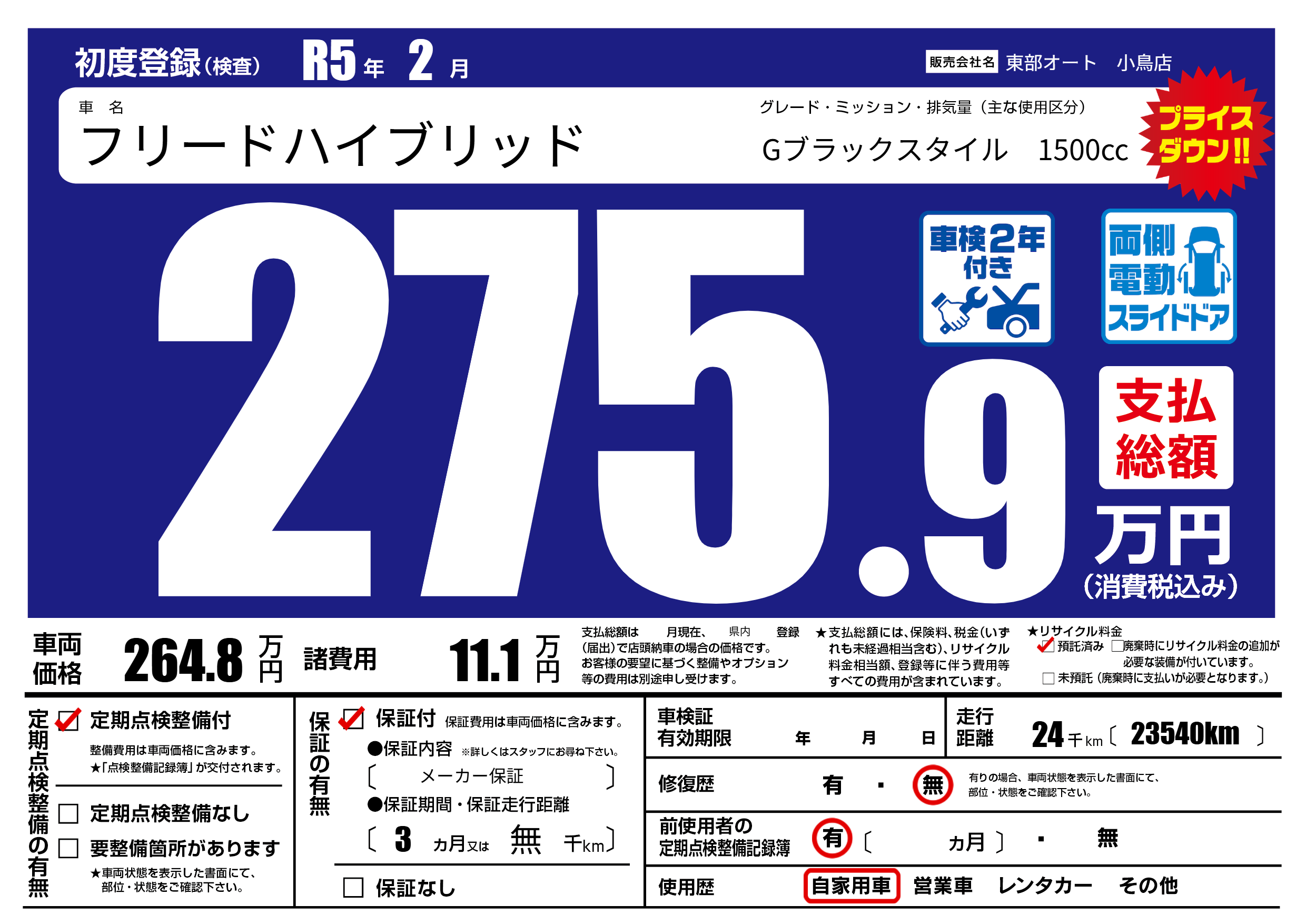 | 車名 | フリードハイブリッド | グレード ミッション 排気量 |