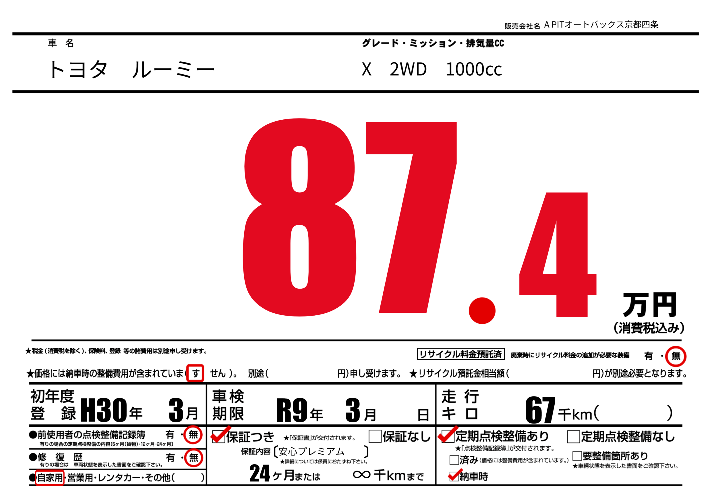 | 車名 | トヨタ ルーミー | グレード ミッション 排気量 |