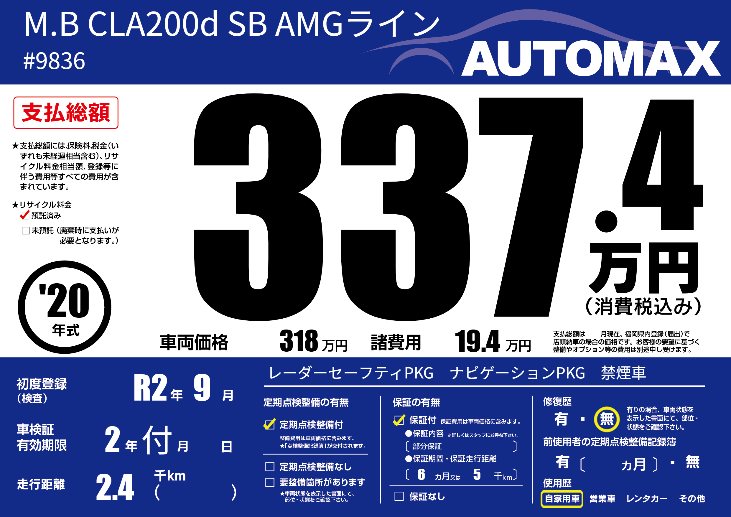 | 車名 | M.B CLA200d SB AMGライン | グレード ミッション 排気量 |