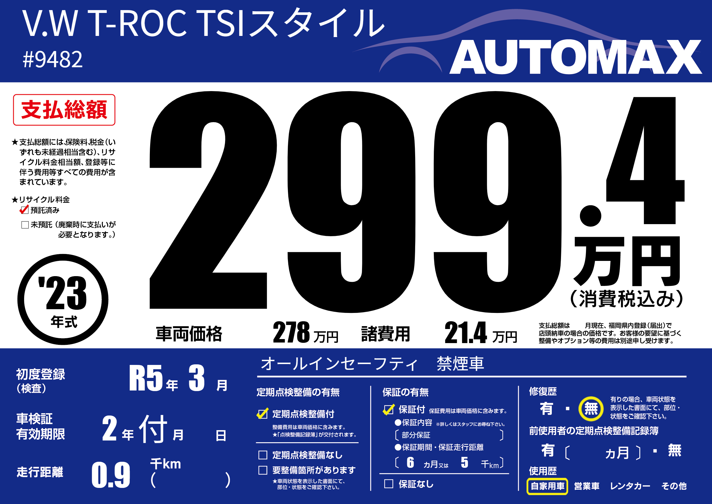 | 車名 | V.W T-ROC TSIスタイル | グレード ミッション 排気量 |
