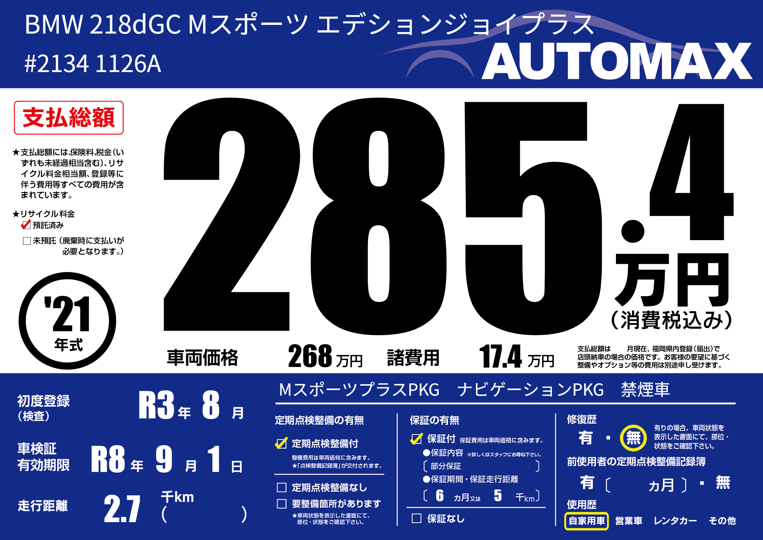 | 車名 | BMW 218dGC Mスポーツ エデションジョイプラス | グレード ミッション 排気量 |