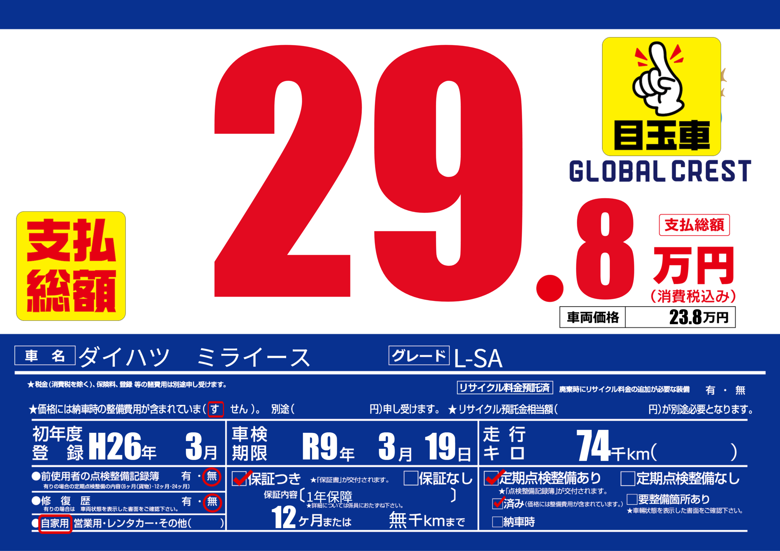 | 定期点検整備 | 定期点検整備あり 定期点検整備済み | ||