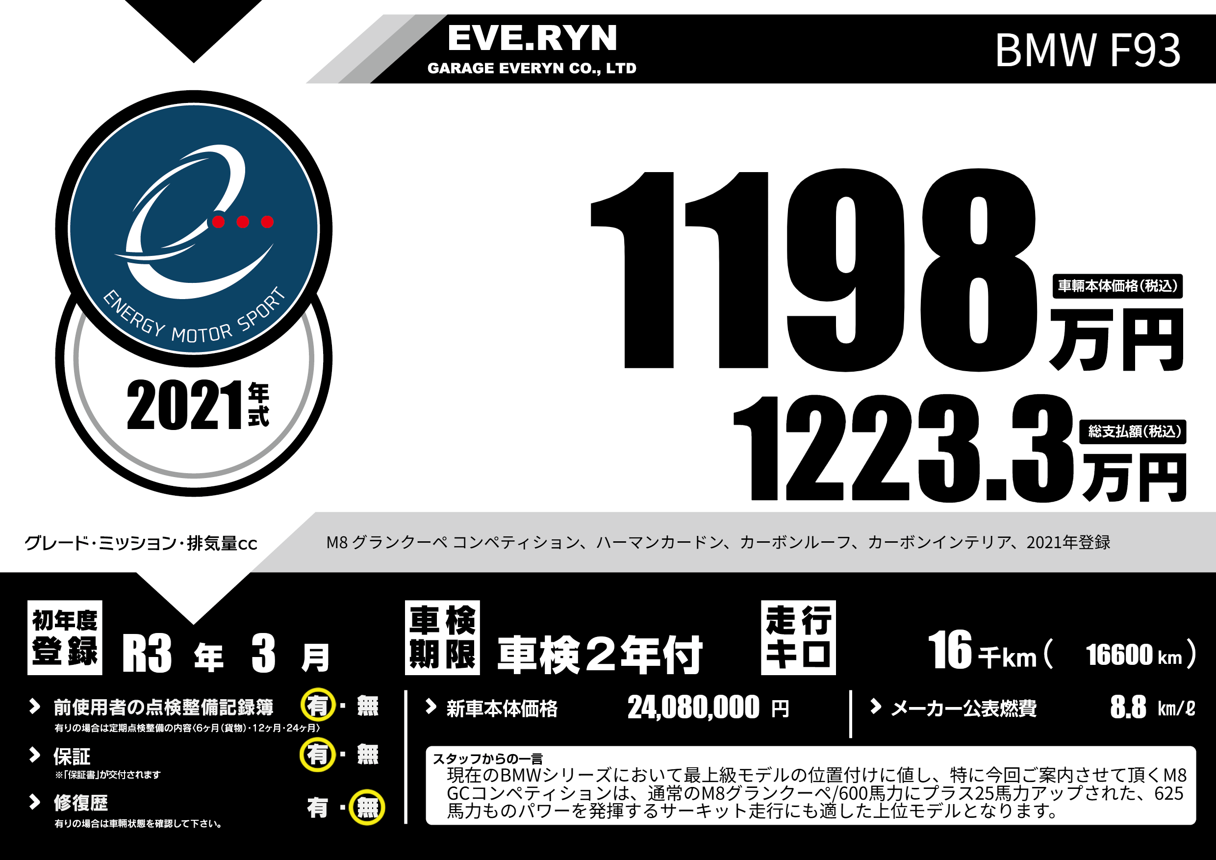 | 車名 | BMW F93 | グレード ミッション 排気量 |