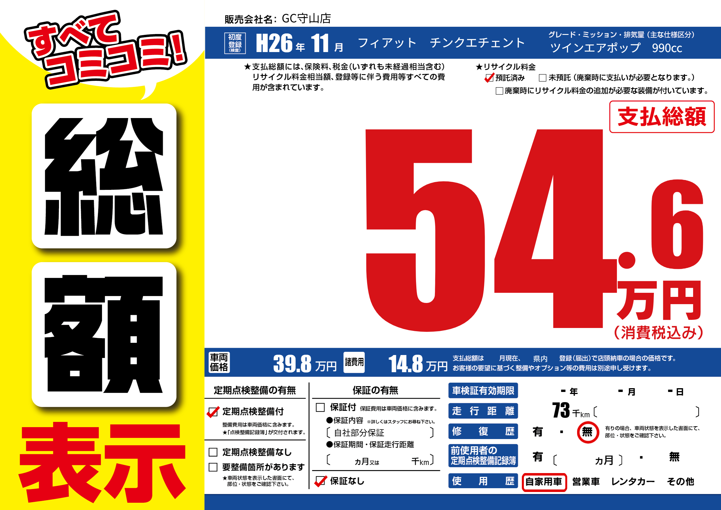 | 車名 | フィアット チンクエチェント | グレード ミッション 排気量 |