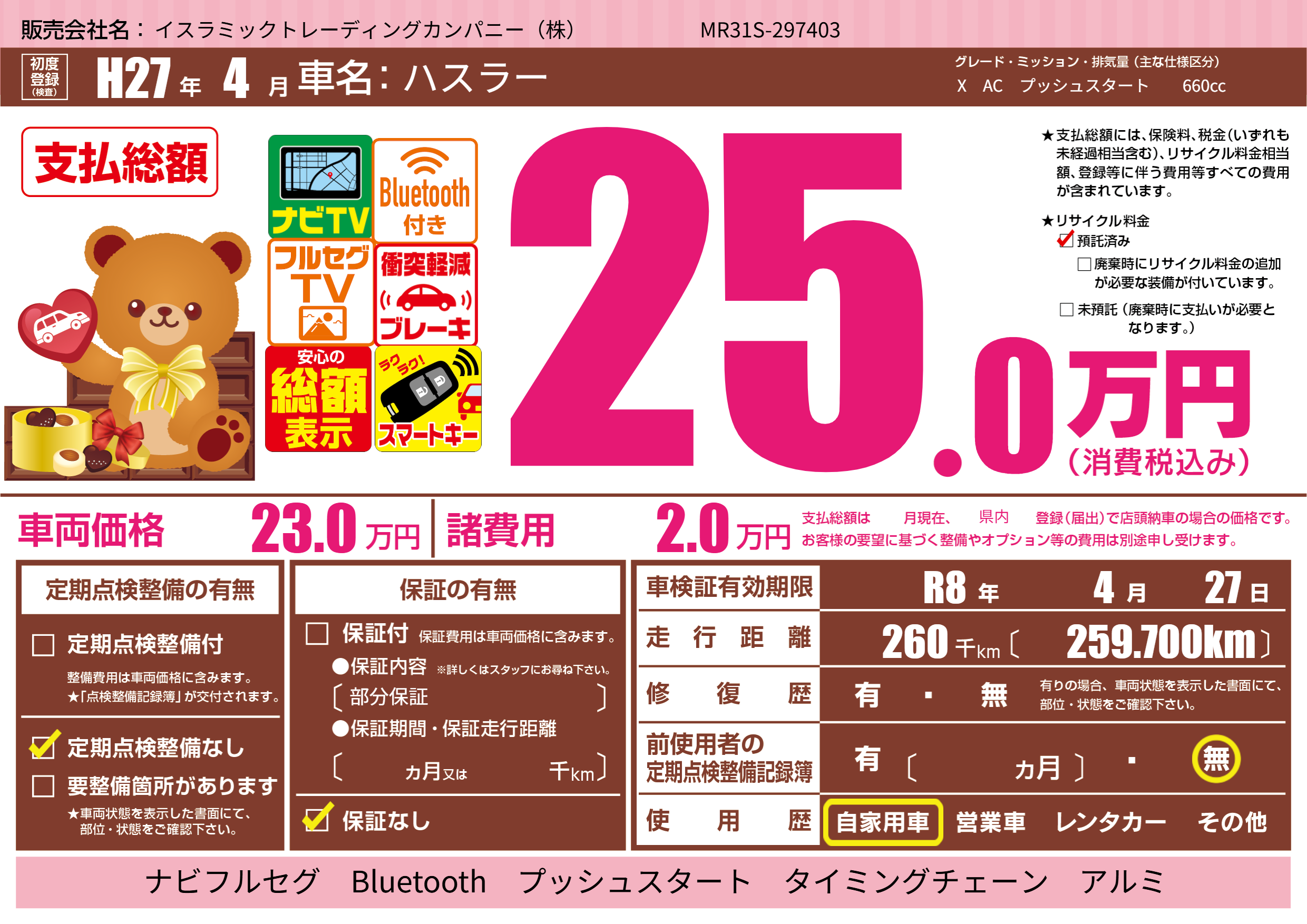 | 走行キロ | 26万km | 初年度登録 | H27年4月 |