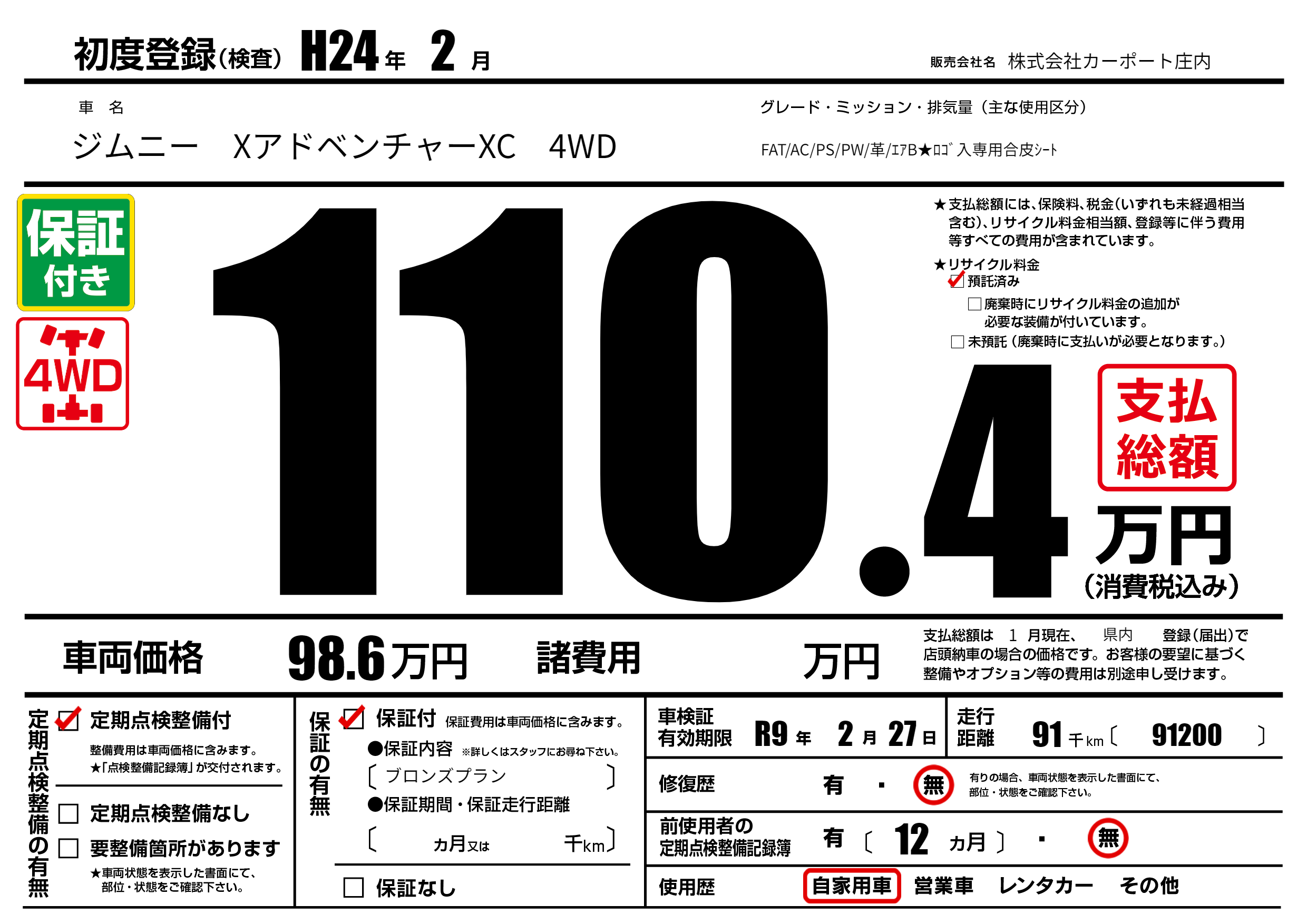 | 車名 | ジムニー XアドベンチャーXC 4WD | グレード ミッション 排気量 |