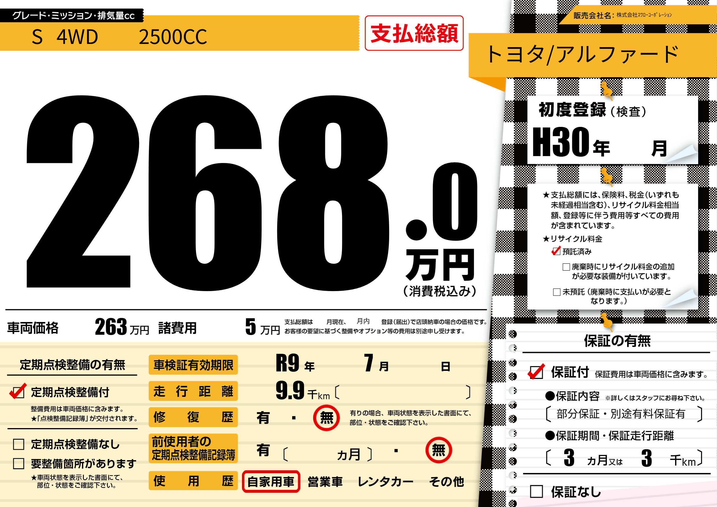 保証付き 保証内容(部分保証・別途有料保証有) 3ヶ月または(3)千kmまで |