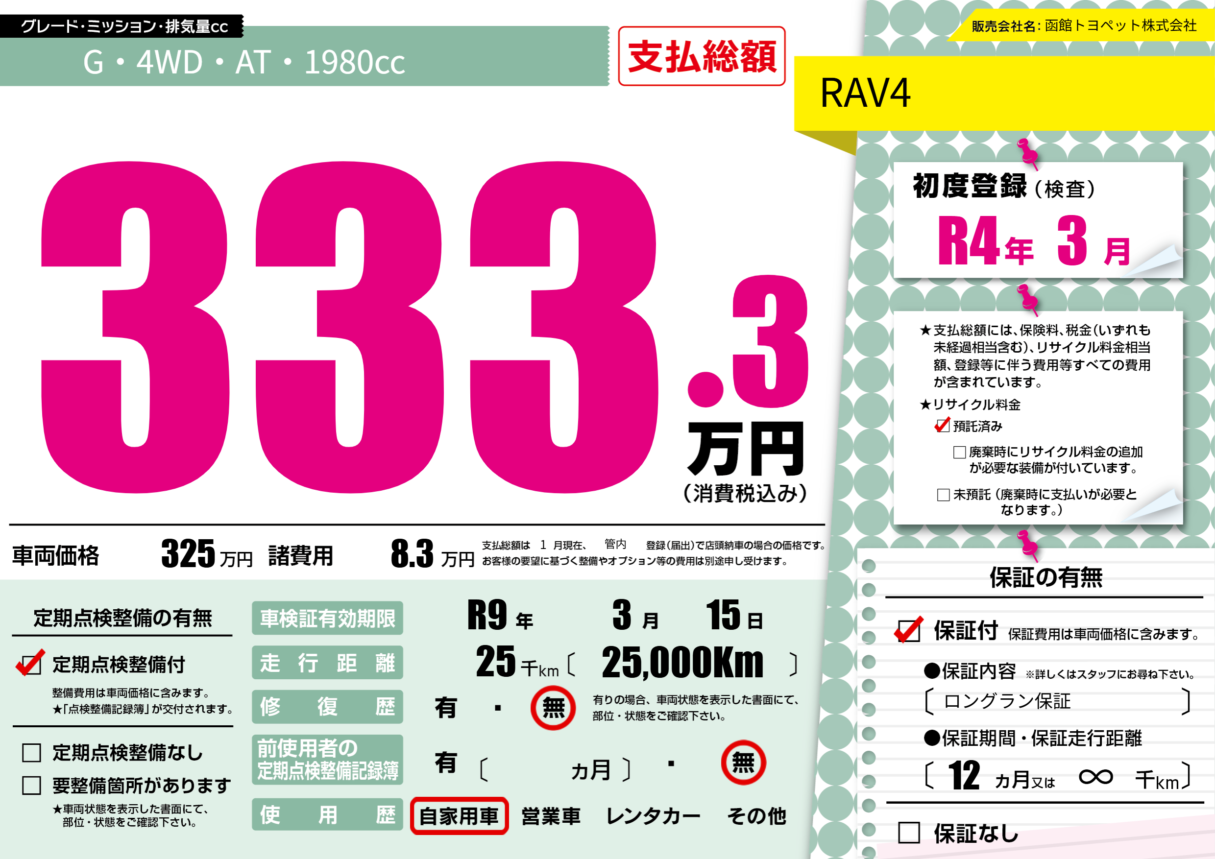 | 車名 | RAV4 | グレード ミッション 排気量 |