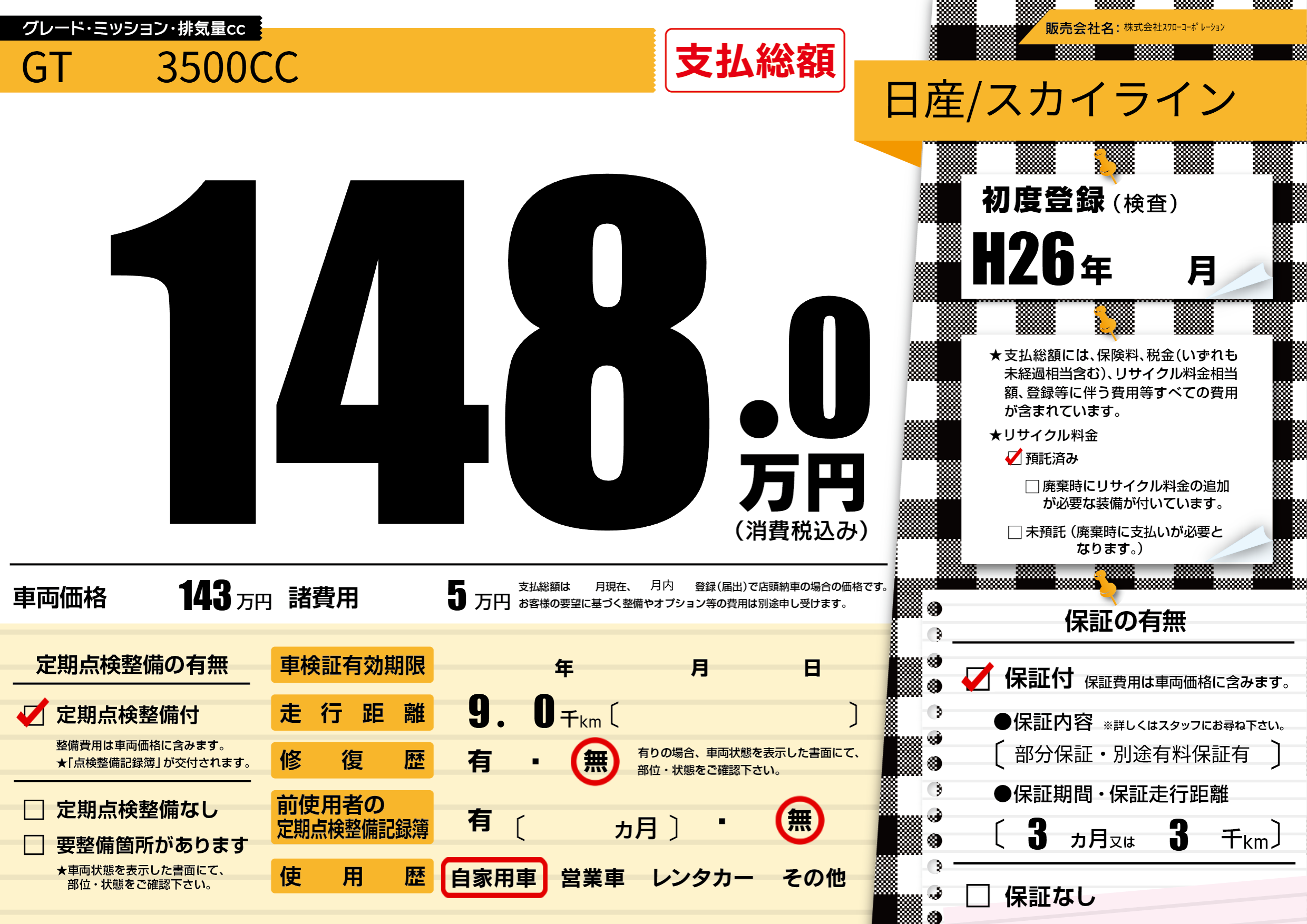 | 車名 | 日産/スカイライン | グレード ミッション 排気量 |