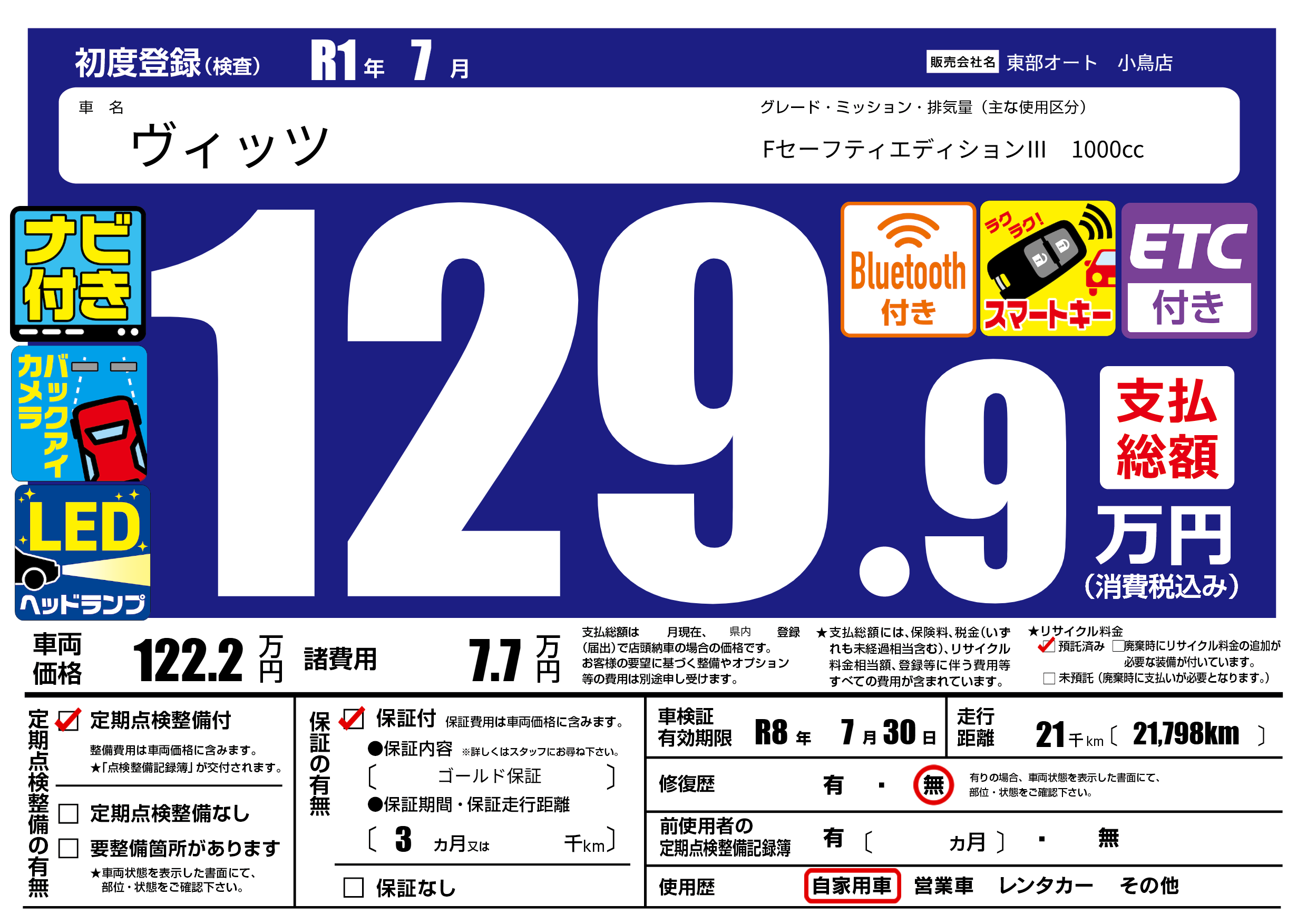 | 走行キロ | 2.1万km | 初年度登録 | R1年7月 |