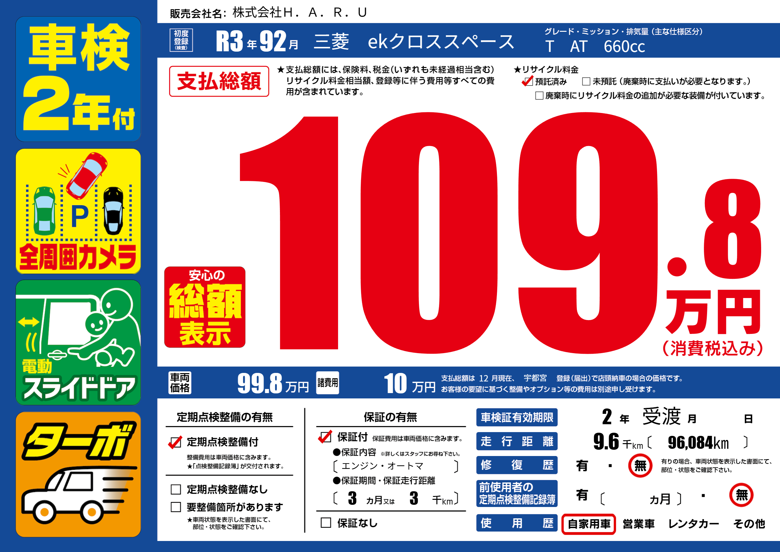 | 車検制限 | 2年 受渡月 - 日 | ||