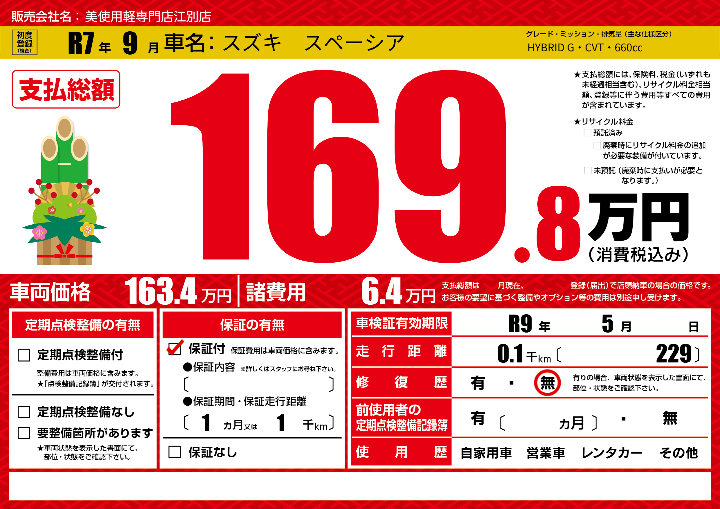 | 走行キロ | - | 初年度登録 | R7年9月 |